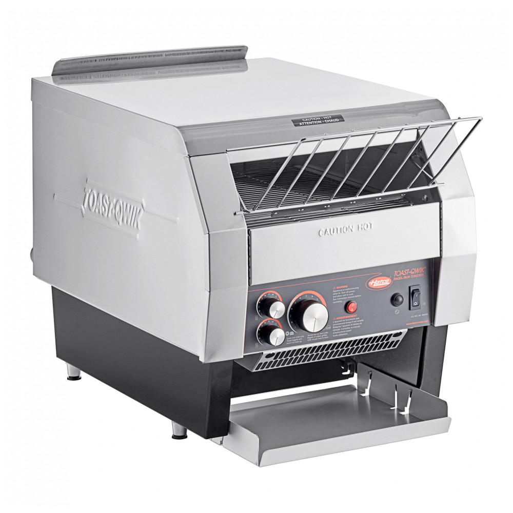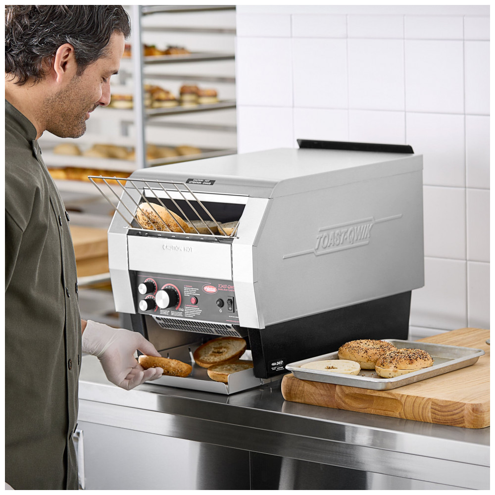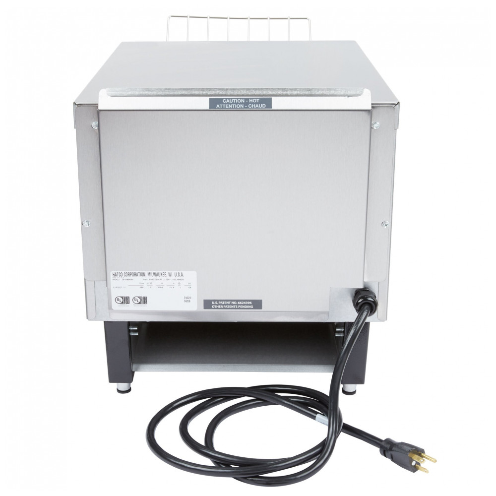 A Hatco TQ-800HBA Toast Qwik é uma torradeira conveyor horizontal de um lado para bancada, otimizada para médio volume de bagels, pães e muffins ingleses, com capacidade de 840 metades por hora. Possui abertura de 7,6 cm para itens mais grossos, sistema ColorGuard que monitora temperatura da câmara via sonda e ajusta automaticamente velocidade da cinta para consistência na torra.
