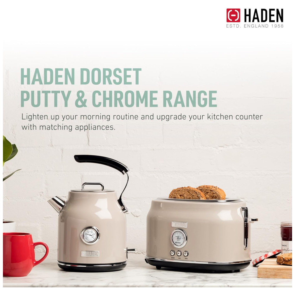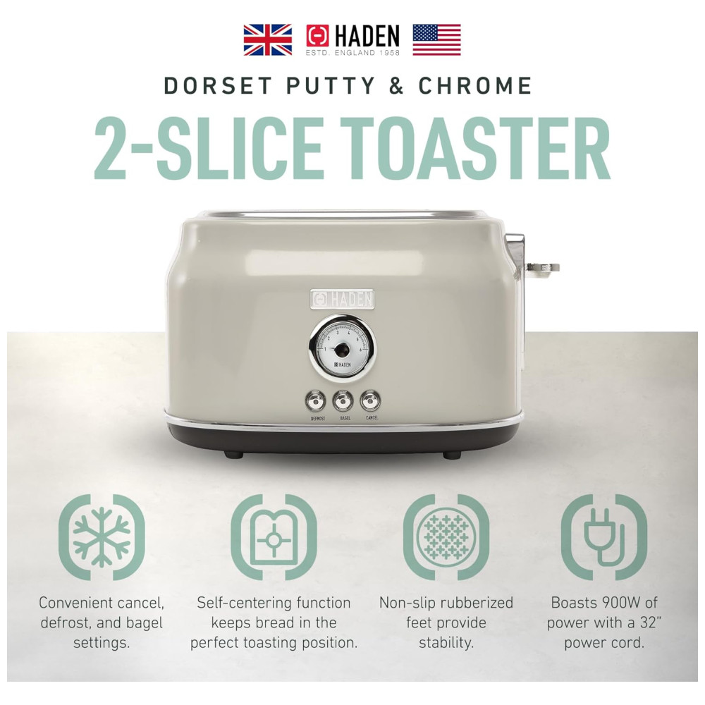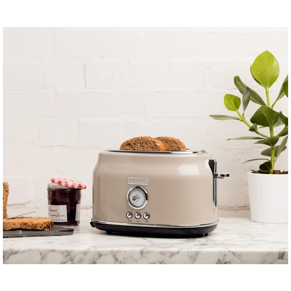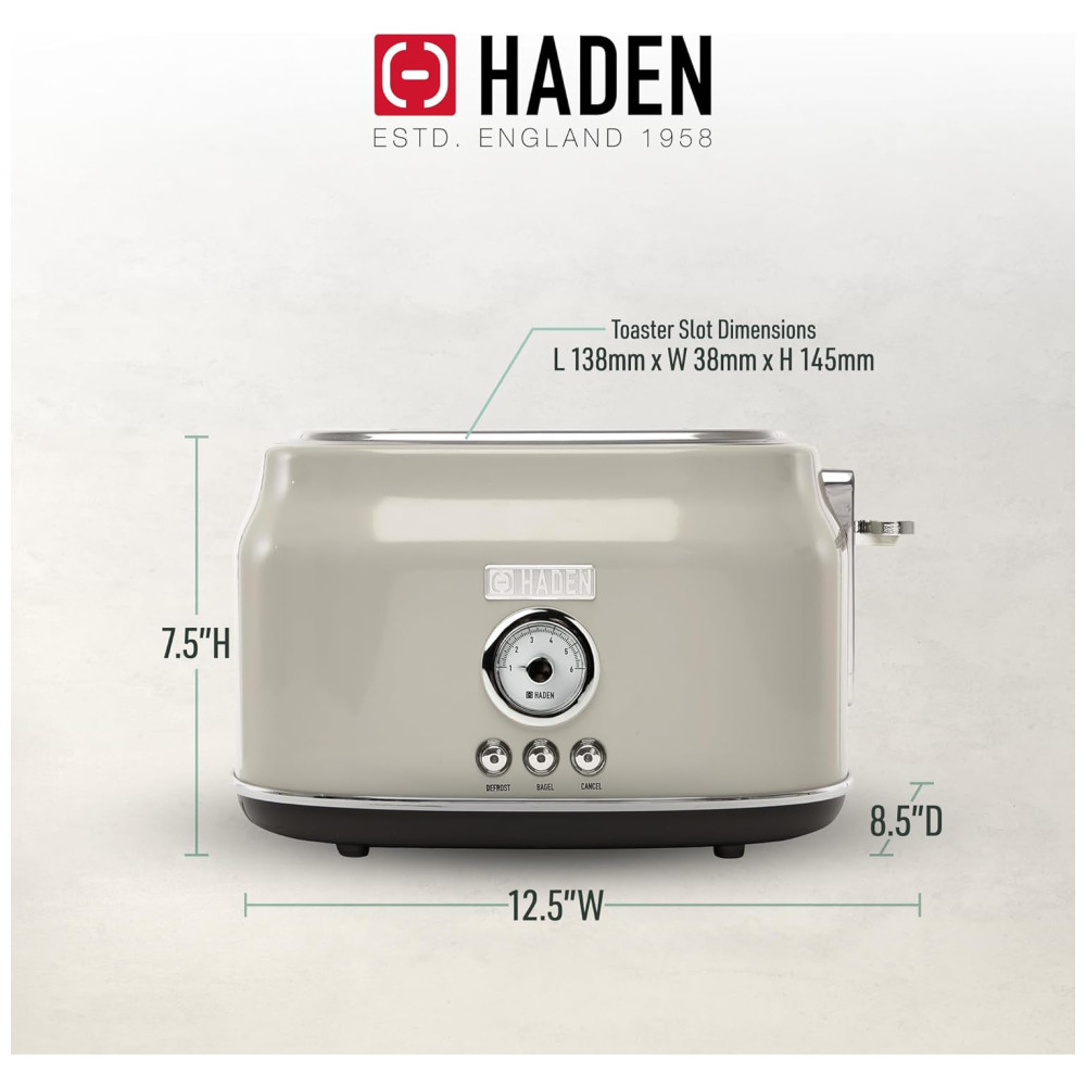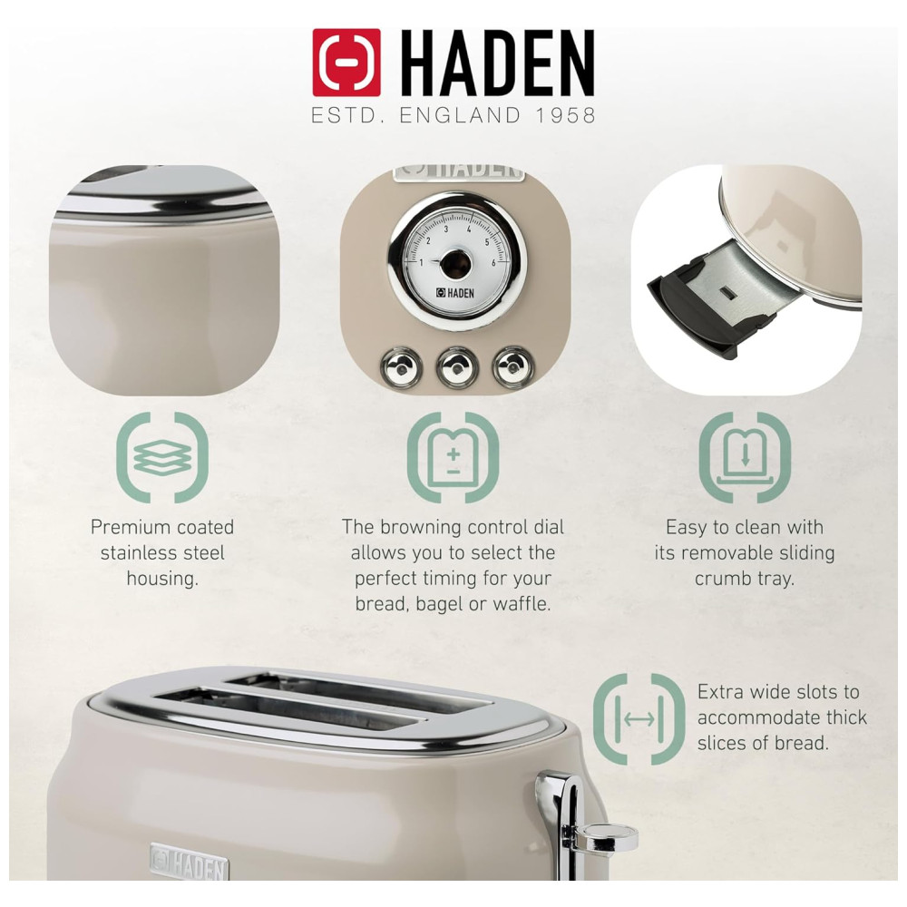 Torradeira de 2 fatias com ranhuras extra largas. Carcaça pintada de cor sólida, detalhes em plástico e emblema HADEN