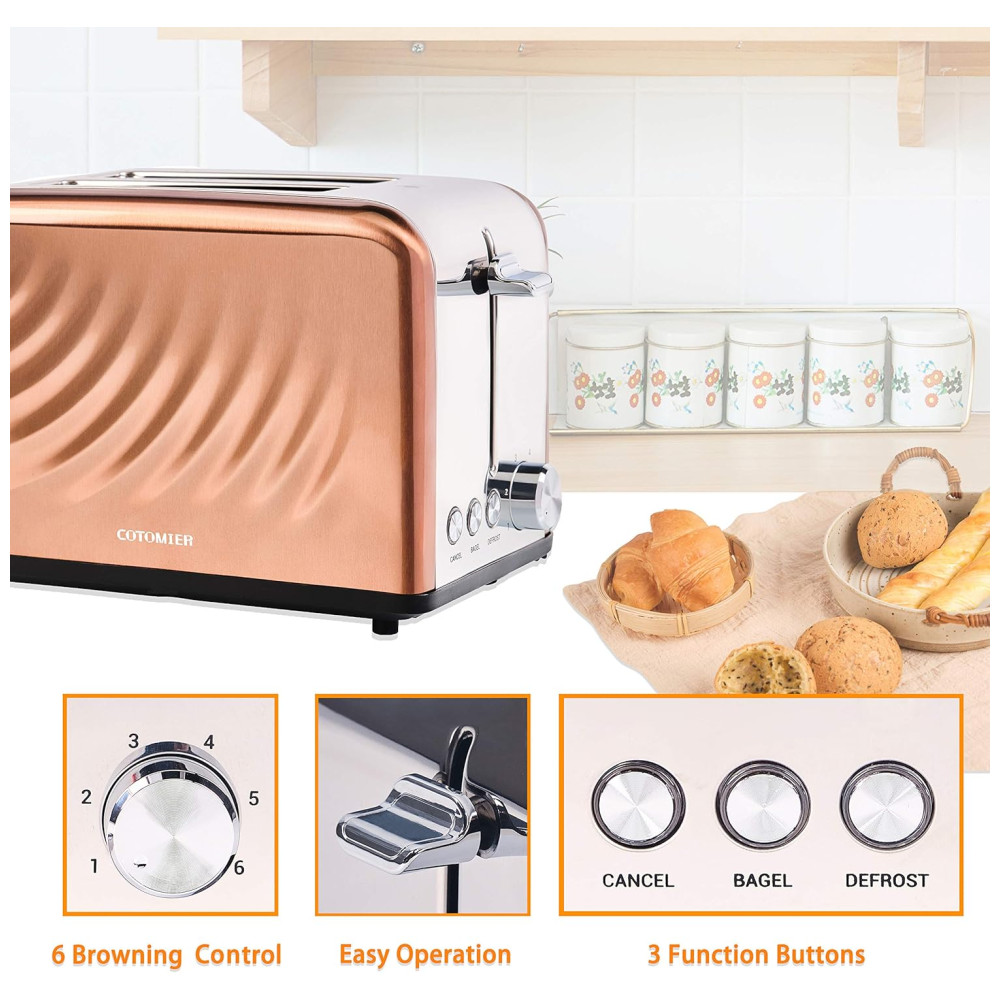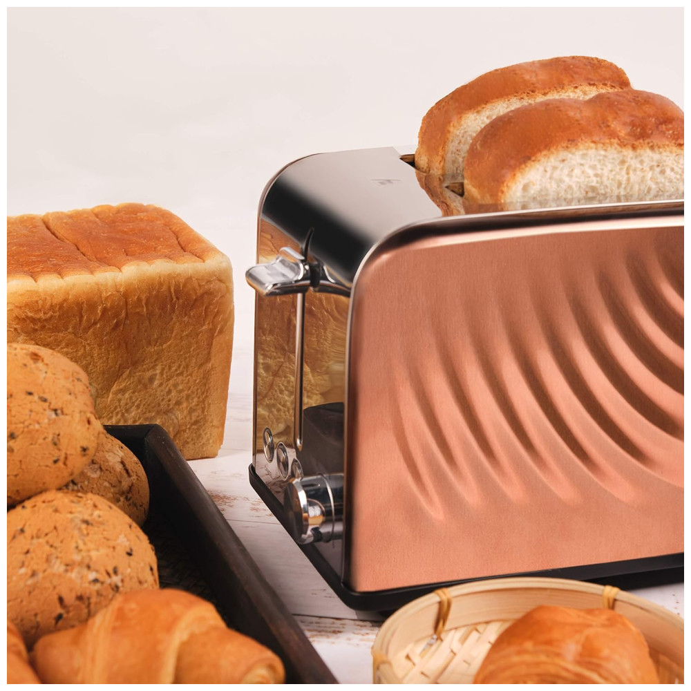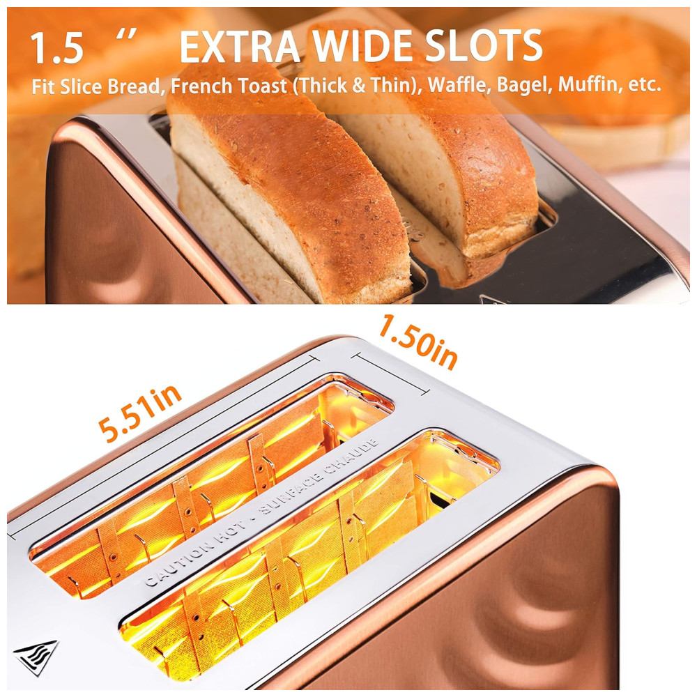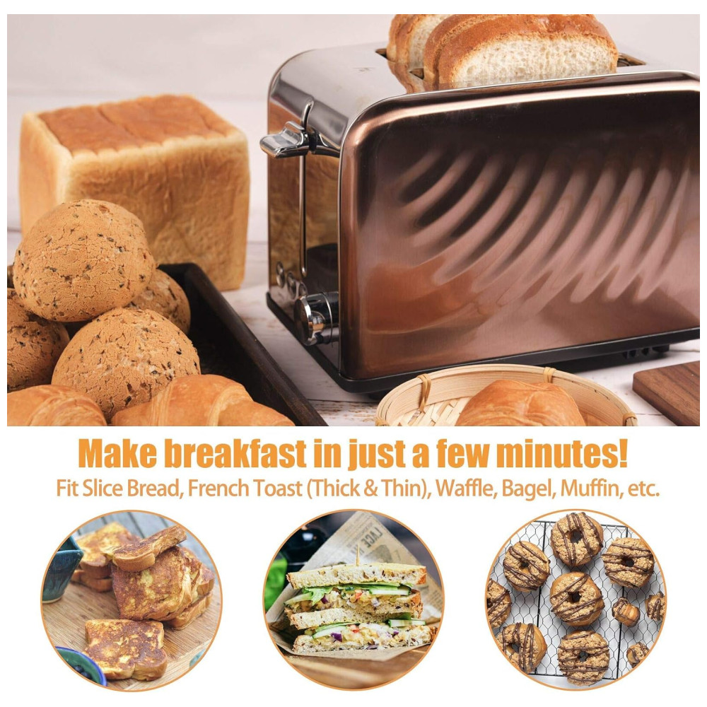 Torradeira de aço inoxidável com design exclusivo Cor cobre ouro rosa e ondulação de água projetada, a torradeira tem uma aparência elegante e adiciona um senso de nobreza à sua cozinha. Com o Inox interno e externo, esta torradeira é absolutamente segura para a saúde de sua família. Ao contrário de outras torradeiras de plástico, a caixa de metal garante torradas sem mau cheiro.
