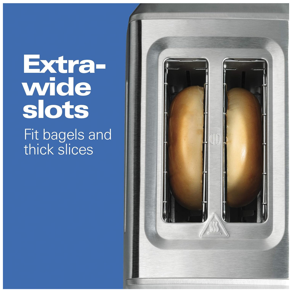 2 slots profundos e largos A torradeira de 2 fatias tem grandes aberturas para encaixar facilmente bagels, fatias grossas de pão e torradas do Texas, além de favoritos menores, como muffins ingleses e waffles congelados.