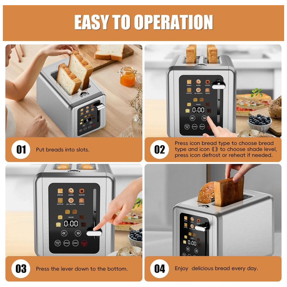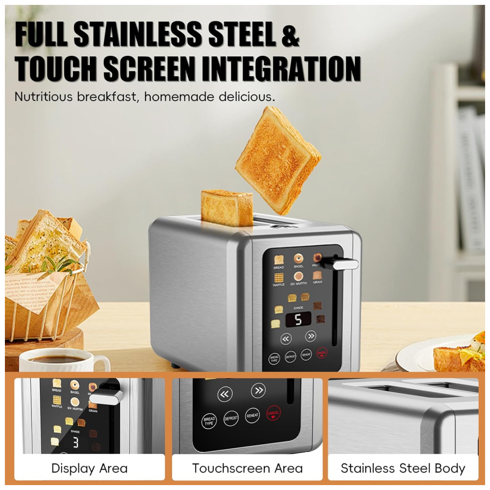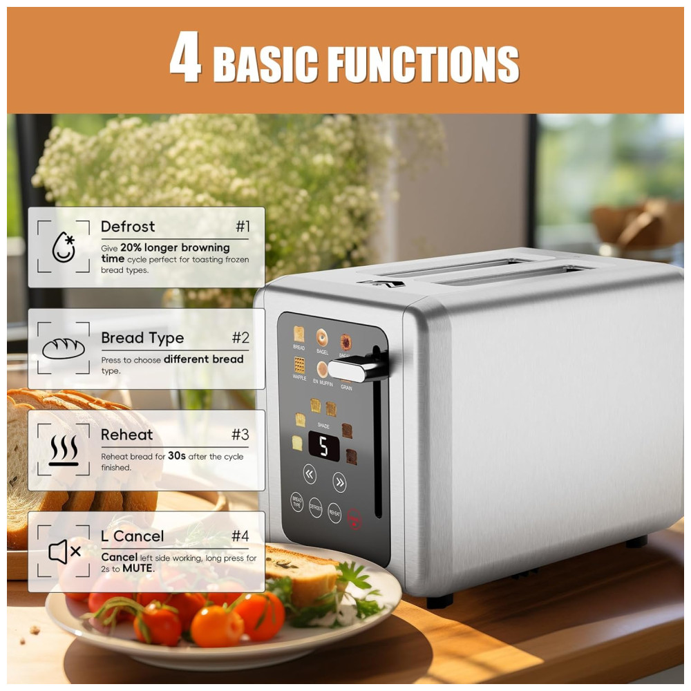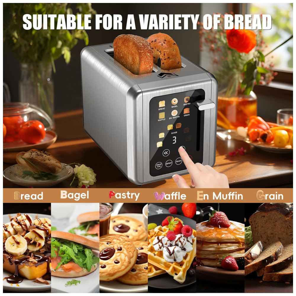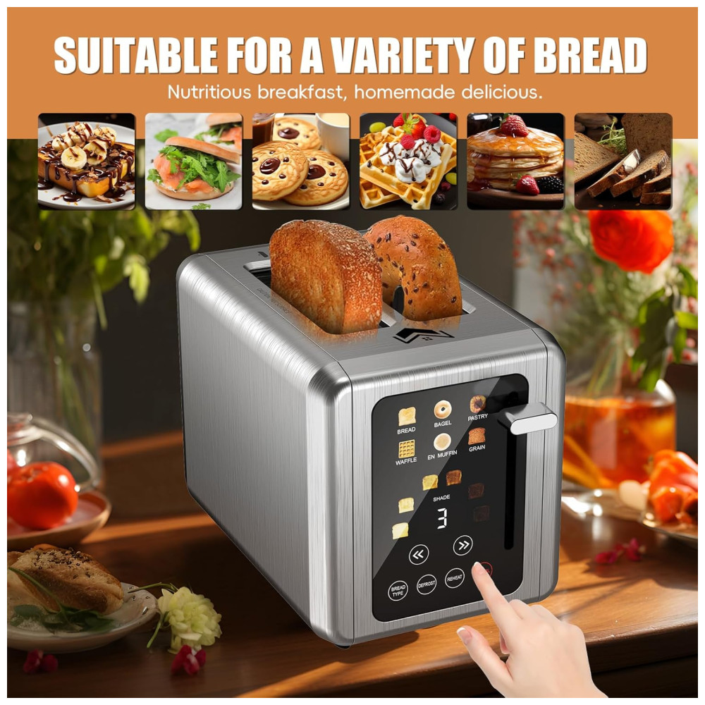 Torradeira de 2 fatias em Aço Inoxidável c/ Timer Digital 6 Níveis de Torra e 6 Tipos de Pão Tela Sensível ao Toque e Espaço Extra LargoWUNLY.
