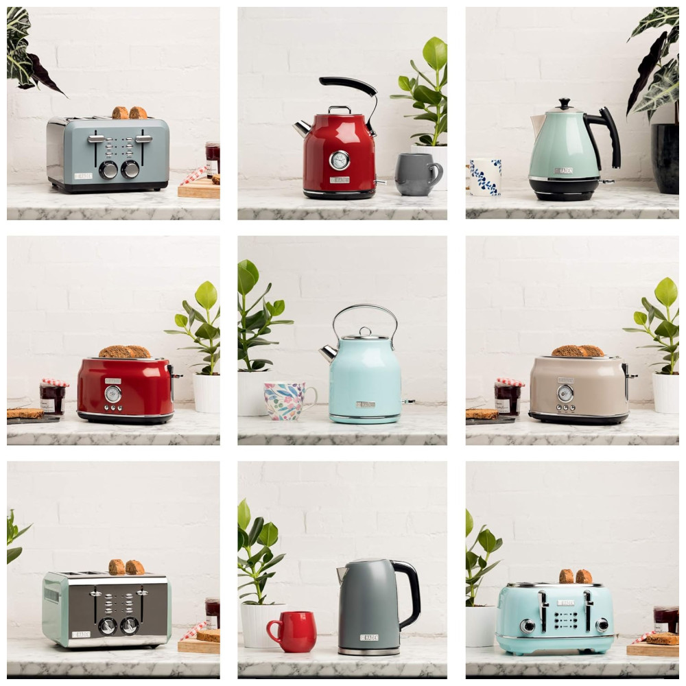 Características Torradeira de quatro fatias com ranhuras extra largas para bagels, caixa de aço inoxidável pintada com emblema Haden, função autocentrante e bandeja removível para migalhas