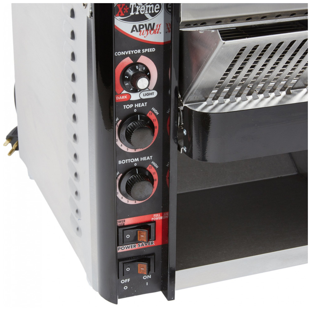 A Torradeira de Esteira da APW Wyott é perfeita para quem busca praticidade e eficiência. Com capacidade para torrar até 800 fatias de pão por hora, possui abertura de 3,8 cm para pão, bagels, muffins e outros tipos de pães. Sua esteira de 25,4 cm de largura, com controle de velocidade variável, e elementos de aquecimento superior e inferior ajustáveis garantem um tostado perfeito. Conta com sistema de convecção pré-aquecido para aquecer e secar o pão antes de tostar. O exterior se mantém frio ao toque e a circulação de ar mantém as peças internas resfriadas quando não está em uso.