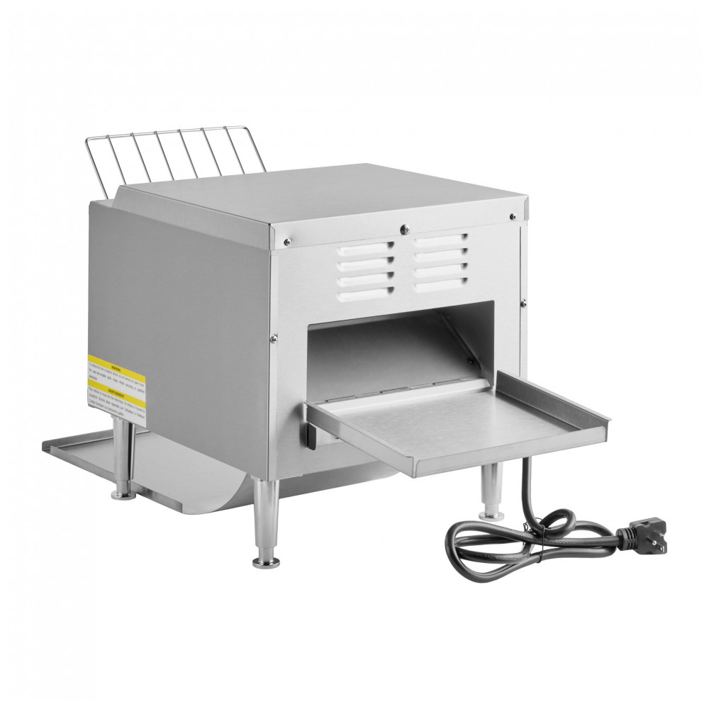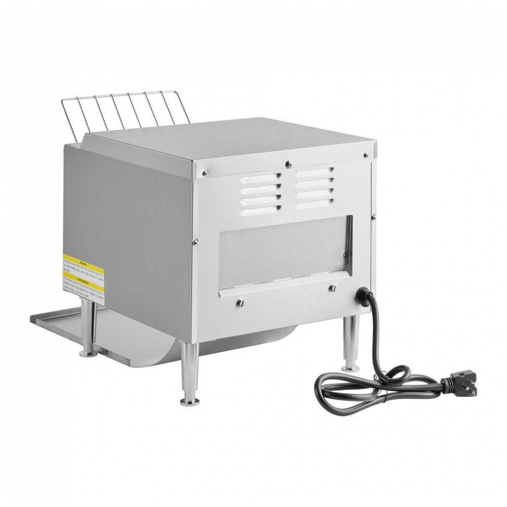 Esta torradeira de esteira é perfeita para qualquer cozinha comercial, sendo rápida, eficiente e fácil de usar. Com capacidade para torrar até 300 fatias de pão por hora, é possível acomodar desde fatias tradicionais de pão branco até metades de bagels robustos. Possui controle de velocidade ajustável para níveis de torra personalizados e pode ser colocado em modo de espera para economizar energia. Seu design único ajuda a produzir torradas perfeitas sem ressecar o produto. Esta torradeira de esteira pode torrar até 300 fatias de pão ou metades de bagel por hora em sua esteira de 10 polegadas, permitindo atender às horas mais movimentadas do dia. Além disso, graças ao modo de espera econômico, é possível conservar energia quando a torradeira não está em uso. Ela requer uma conexão elétrica de 110V para operação. O modo de espera mantém os elementos em potência reduzida para conservar energia entre os períodos de refeição, mas reduz o tempo de pré-aquecimento ao entrar em períodos de alto movimento. Para versatilidade, esta torradeira pode dispensar o produto pela frente ou pela parte traseira nas calhas incluídas. Além disso, possui 3 aberturas para acomodar grandes quantidades dos seus alimentos mais populares, desde pães fatiados tradicionais até bagels e torradas. Dispensar o produto pela parte traseira permite versatilidade de passagem da cozinha para o salão, enquanto dispensar o produto pela frente reduz a pegada de balcão da unidade e até permite que os usuários preparem o próprio produto para reduzir o custo da mão de obra. Diferentes tipos de pães torram de maneira diferente, desde branco e centeio até integral granuloso. Para ajustar a torradeira para a configuração perfeita, use o seletor fácil de usar na frente para diminuir ou aumentar a velocidade da esteira. Quanto mais rápido se move, menos tostado o pão ficará. Isso também é ótimo para garantir que a torrada de um cliente seja tostada conforme a preferência de crocância deles! A cozinha comercial é um ambiente rigoroso, então esta torradeira é construída de acordo. É um ótimo aliado para cafeterias, buffets e cafeterias, especialmente durante o rush matinal! Sua parte externa de aço inoxidável oferece durabilidade de longa duração, enquanto uma bandeja de migalhas removível torna a limpeza fácil.