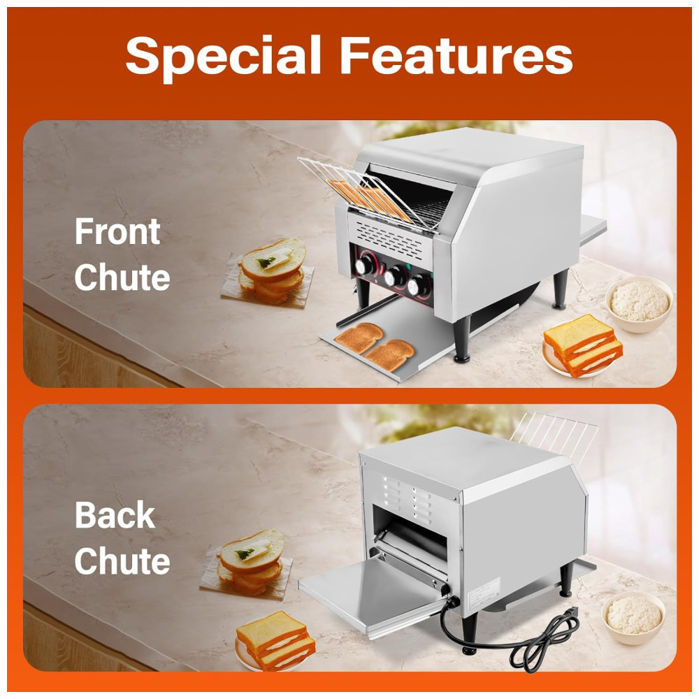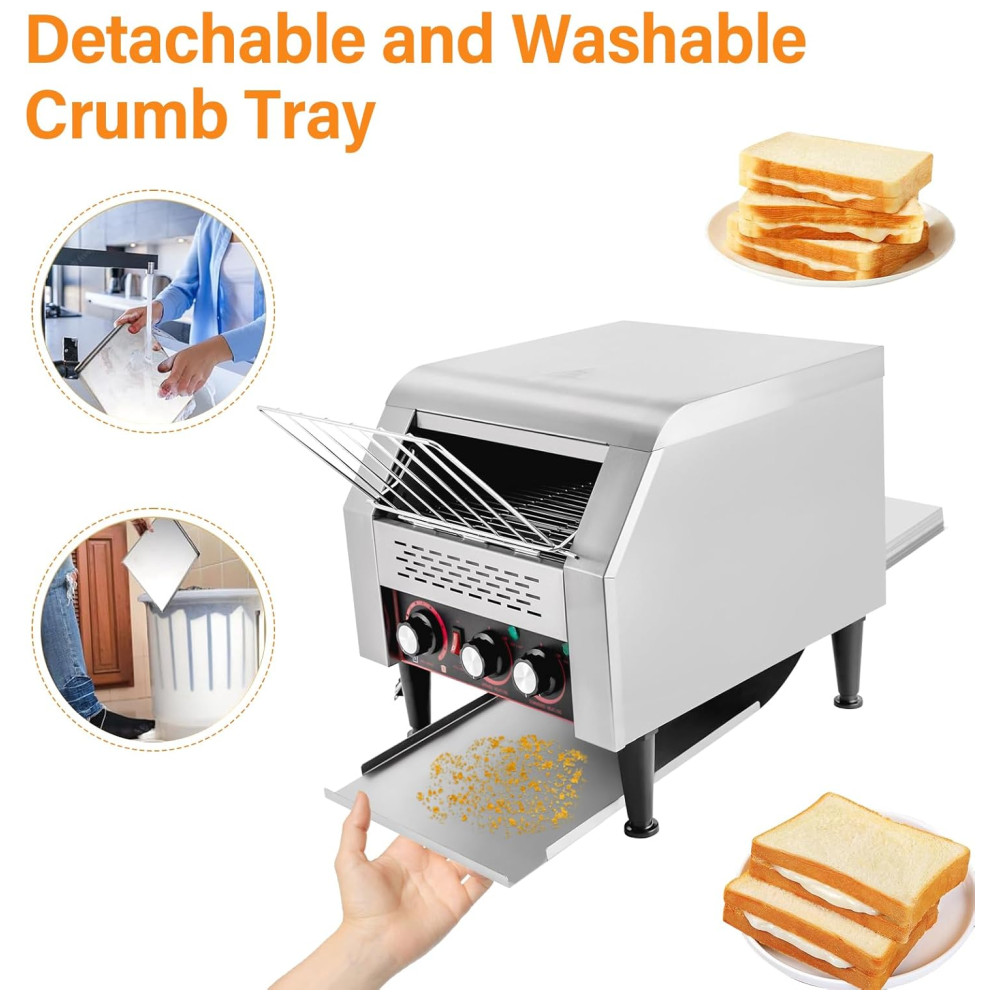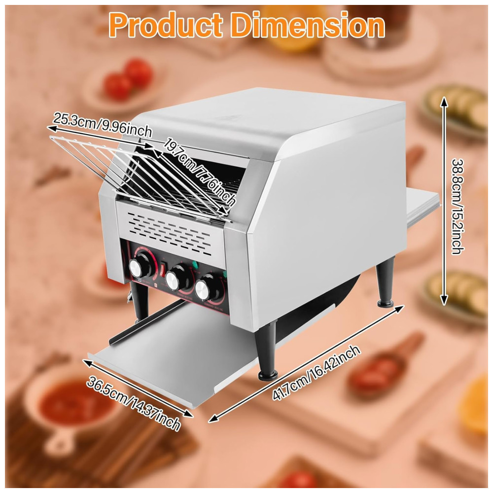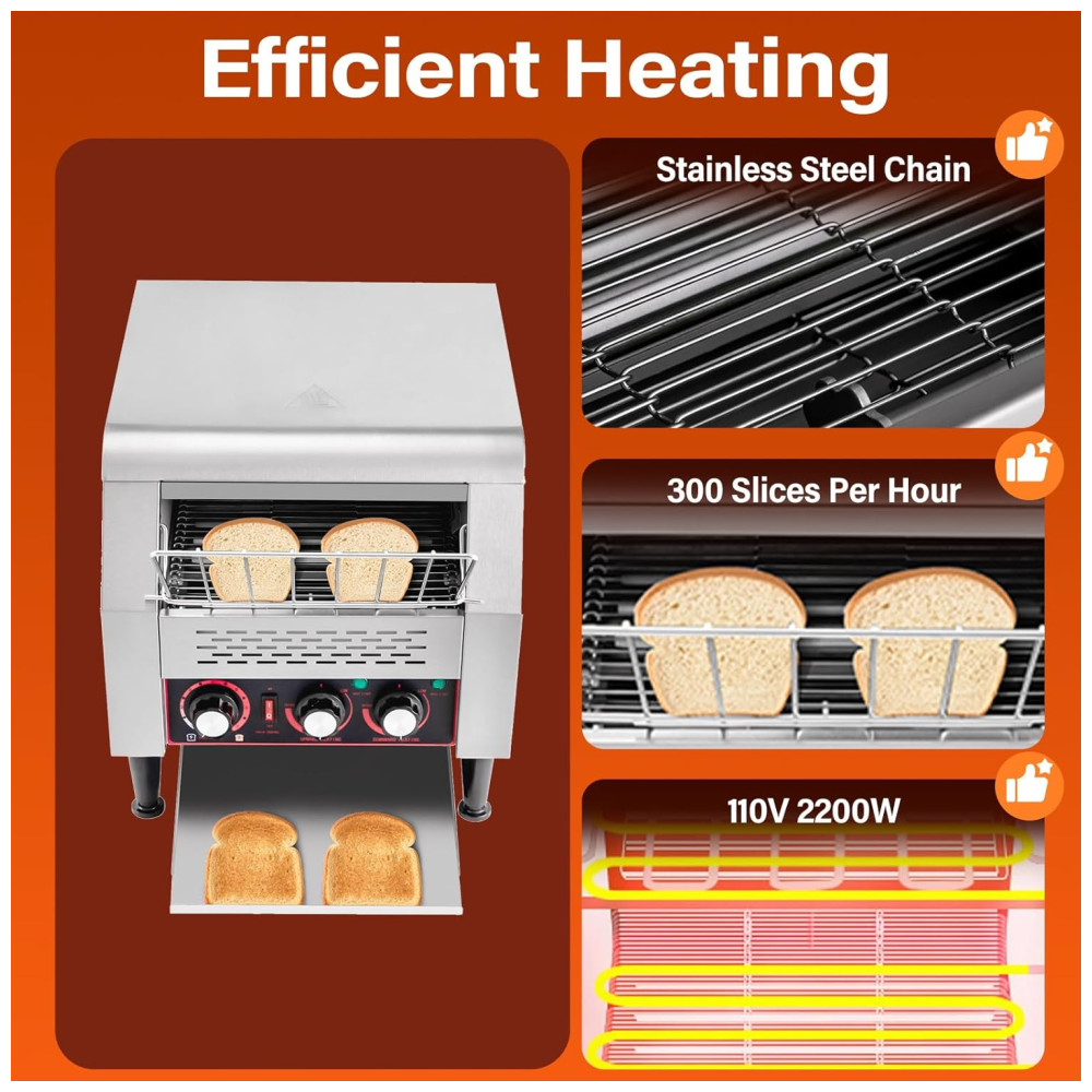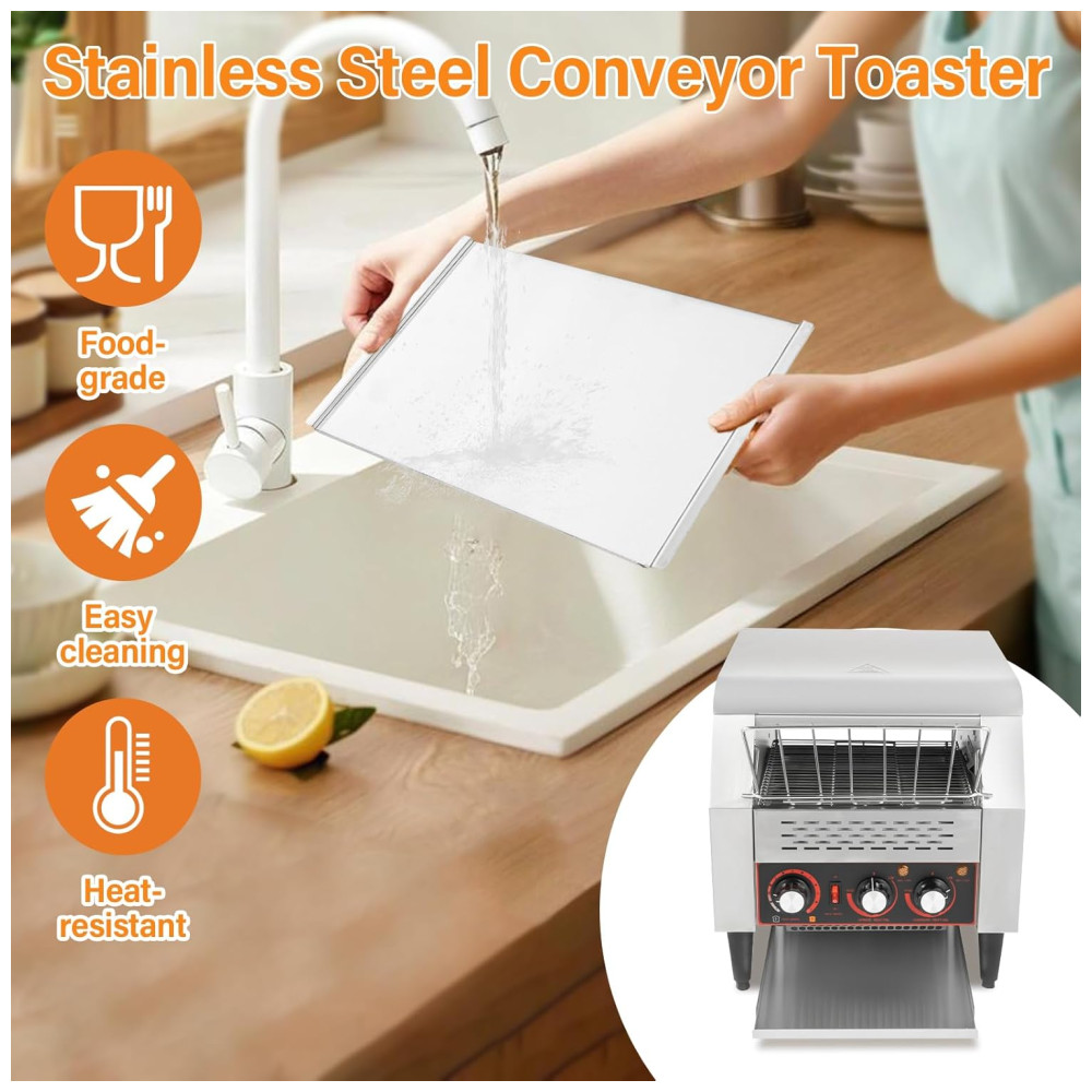 ALTAMENTE EFICIENTE: Esta torradeira de esteira adota um design de alta potência de 2200W para aquecer mais rápido e assim torrar até 300 fatias de pão por hora, proporcionando pães superiores aos seus convidados em pouco tempo. TORRADOR DUPLO: Esta torradeira comercial possui tubos de aquecimento de três anéis superiores e inferiores e dois modos de aquecimento com aquecimento para cima e para baixo, que podem funcionar simultaneamente ou separadamente, permitindo assar de um lado ou dos dois lados. Além disso, você pode ajustar a temperatura de aquecimento girando o botão. VELOCIDADE AJUSTÁVEL: Você pode ajustar a velocidade da torradeira de pão de 1 a 7 níveis para obter pães de diferentes tonalidades e atender às suas diferentes necessidades. DESIGN COMPACTO: A torradeira de pão tem o tamanho de 41,7×36,5×38,8 cm, compacto o suficiente para caber em espaços apertados. FÁCIL DE OPERAR: Projetada com um painel de controle claro, um interruptor de controle, botões de temperatura de aquecimento para cima e para baixo independentes e um botão de velocidades múltiplas, basta inserir o pão na esteira e girar o botão de acordo com suas necessidades.
