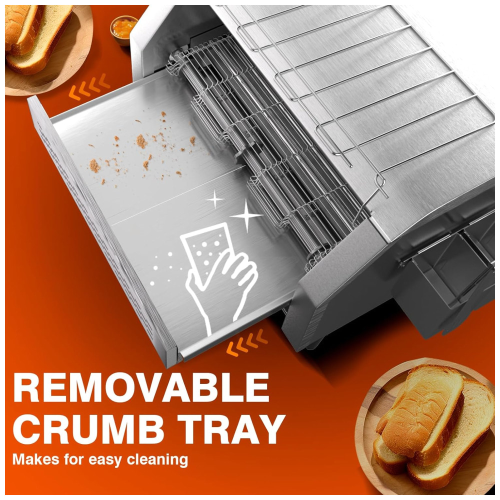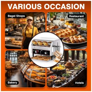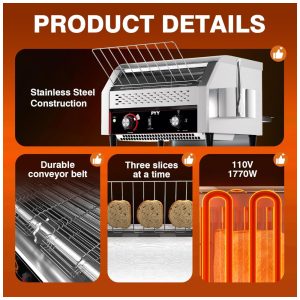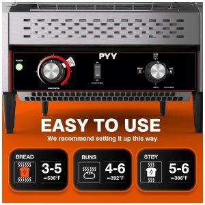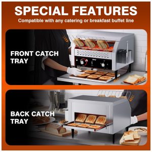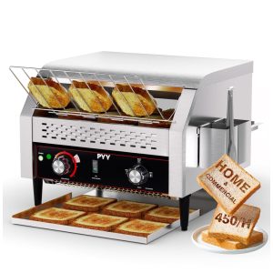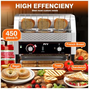A torradeira de esteira comercial da PYY é eficiente e de alta potência, assando rapidamente até 450 fatias de pão por hora. Perfeita para uso em restaurantes, padarias, escritórios, hotéis, escolas, cafeterias e até mesmo para grandes famílias. Com opções de saída frontal e traseira, design compacto que se encaixa facilmente em balcões de cozinha, pés antiderrapantes e fácil limpeza. Feita em aço inoxidável resistente, com ajuste de velocidades e temperatura para atender às necessidades de torragem de diversos tipos de pães e produtos assados.