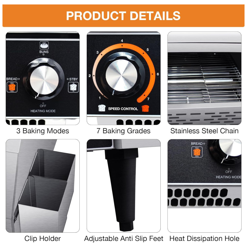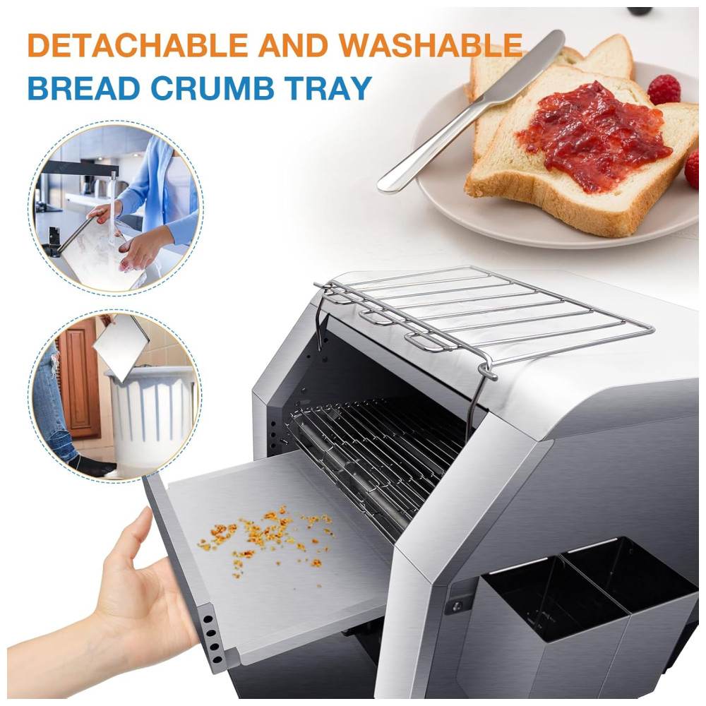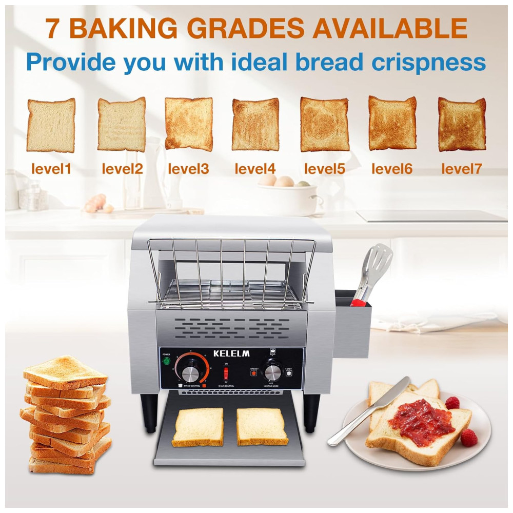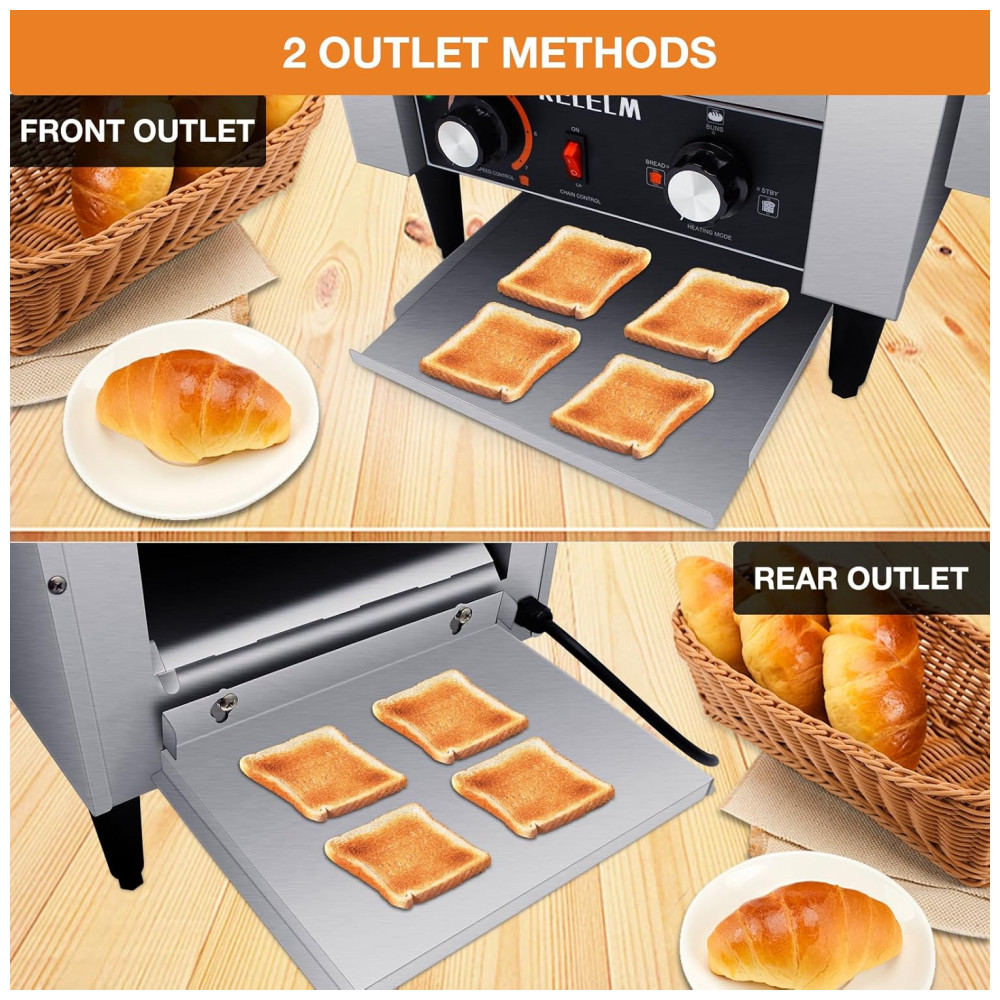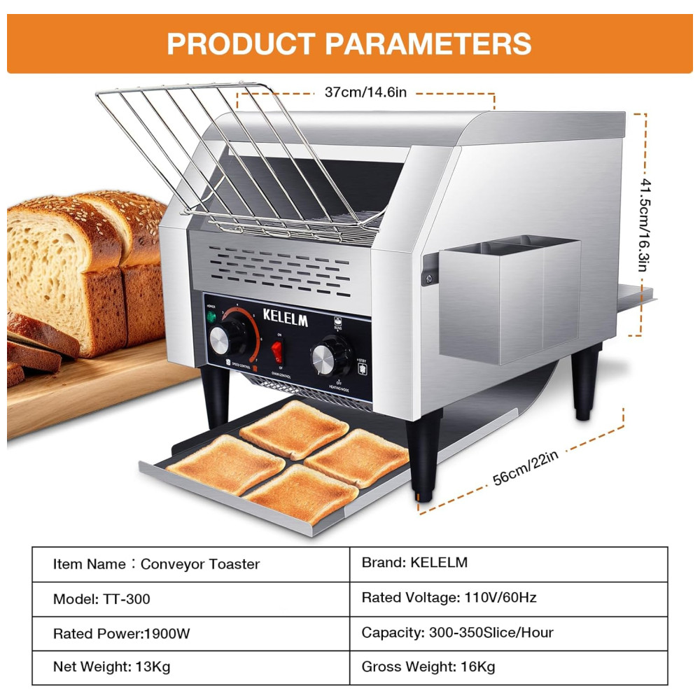 A Torradeira de Esteira Comercial da KELELM é feita de aço inoxidável de qualidade alimentar, resistente, segura e saudável. Com 3 modos de aquecimento e 7 opções de velocidade, você pode controlar o aquecimento e a cor do pão para atender diferentes gostos. Capaz de lidar com até 300-350 fatias por hora, essa torradeira elétrica de esteira economiza tempo. Com saídas de pão frontal e traseira, é perfeita para restaurantes, cafés, hotéis e padarias. O aliado perfeito para agilizar o atendimento em horários de pico.