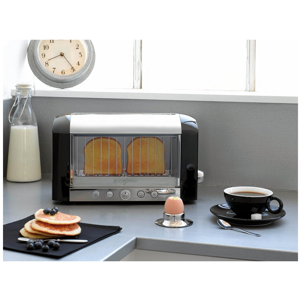 A Torradeira Magimix Vision é a primeira torradeira transparente do mundo. Por fim, toste como quiser com o controle visual. Os elementos de quartzo de longa duração proporcionam um escurecimento consistente e as janelas de vidro com isolamento duplo são fáceis de limpar. O Vision Toaster também inclui recursos de botão único, como uma função de bagel para torrar um lado, função de reaquecimento para reaquecer o pão já torrado sem ressecá lo e uma função de degelo para descongelar e torrar o pão simultaneamente. Controle Visual para torrar do jeito que você gosta Simples de usar 1 botão 1 função Botão Baguette torrar um lado Botão Reheat para reaquecer pão previamente torrado sem ressecá lo Botão Defrost para torrar pão congelado Controle preciso 8 níveis de tostagem Elementos de aquecimento comerciais podem ser substituídos Ranhura extra larga 3,81 centimetros