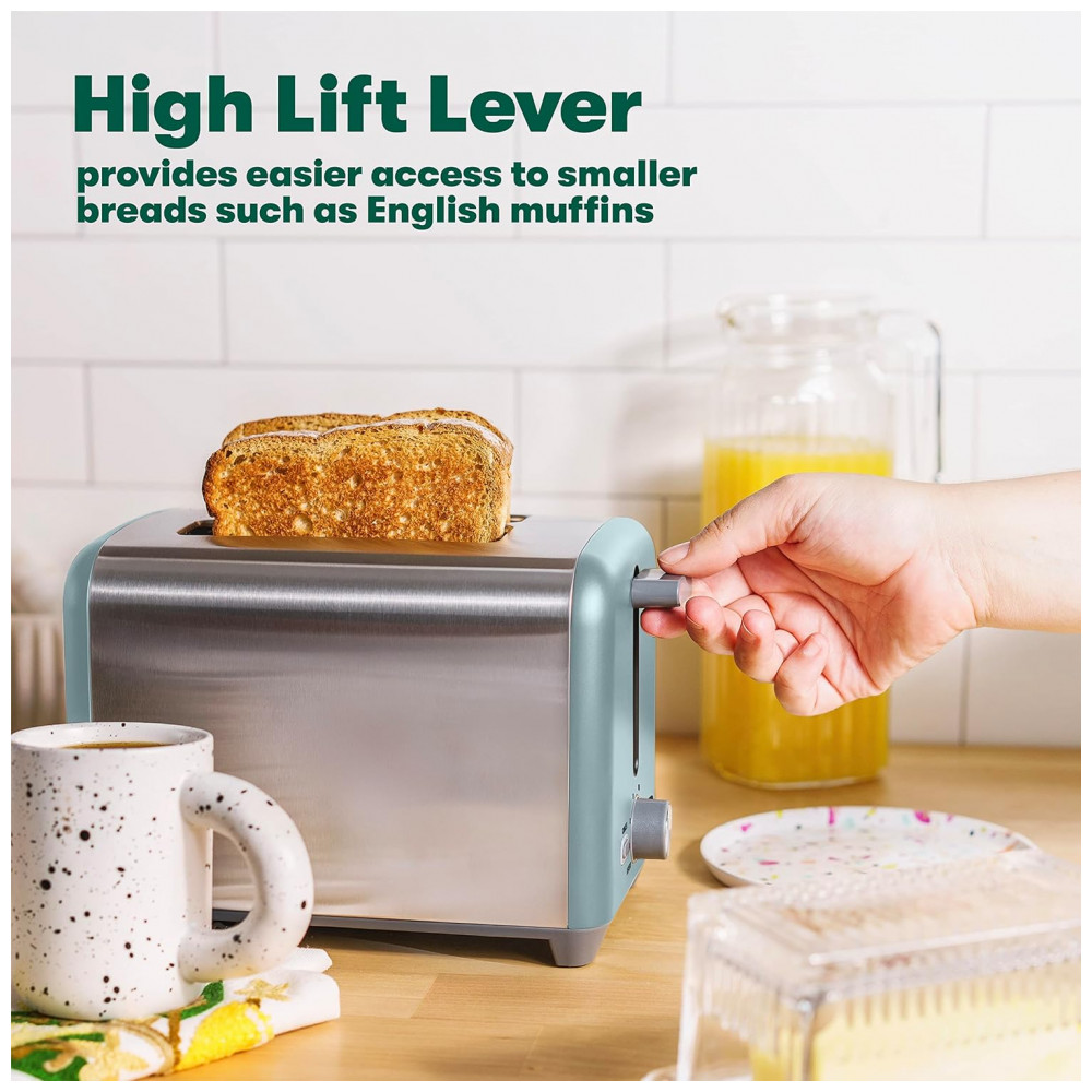 TORRADEIRA DE 2 FATIAS O sistema de aquecimento de 750 Watts desta torradeira oferece resultados rápidos e personalizáveis Controle de tonalidade de 6 configurações com função Reheat para dourar com precisão. Seu elegante e durável acabamento em aço inoxidável escovado certamente iluminará qualquer cozinha