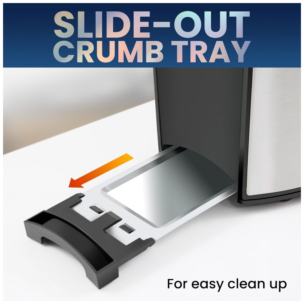 A BANDEJA DE MIGALHAS DESLIZÁVEL se solta facilmente do fundo da torradeira para uma limpeza rápida e fácil de migalhas e detritos.