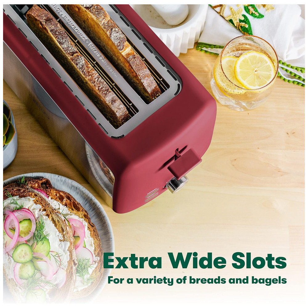 OBTENHA O SABOR QUE VOCÊ AMA Nossa elegante e elegante torradeira de 4 slots oferece 7 opções de sombreamento para ajudá lo a alcançar o nível perfeito de sabor tostado. Com guias autocentrantes e uma alavanca de elevação, você obterá uma douração uniforme e fácil acesso sempre