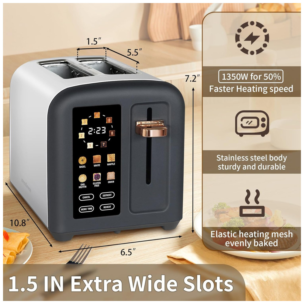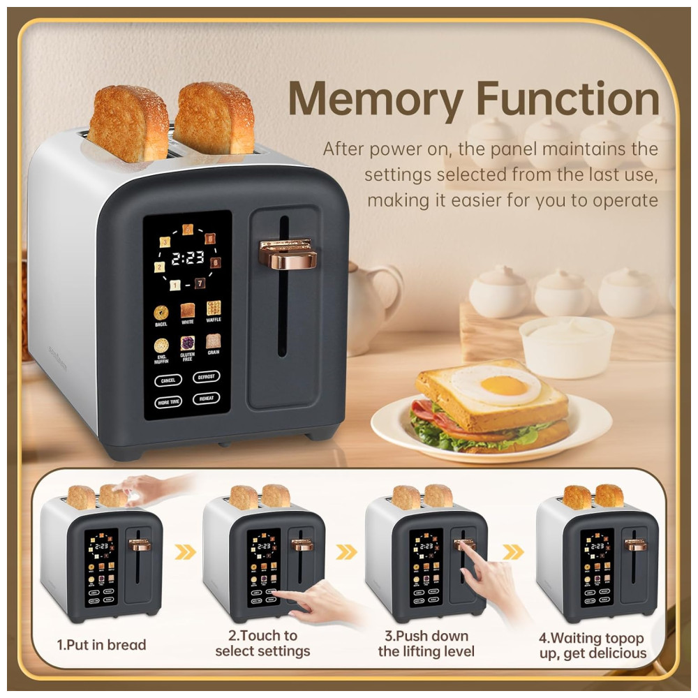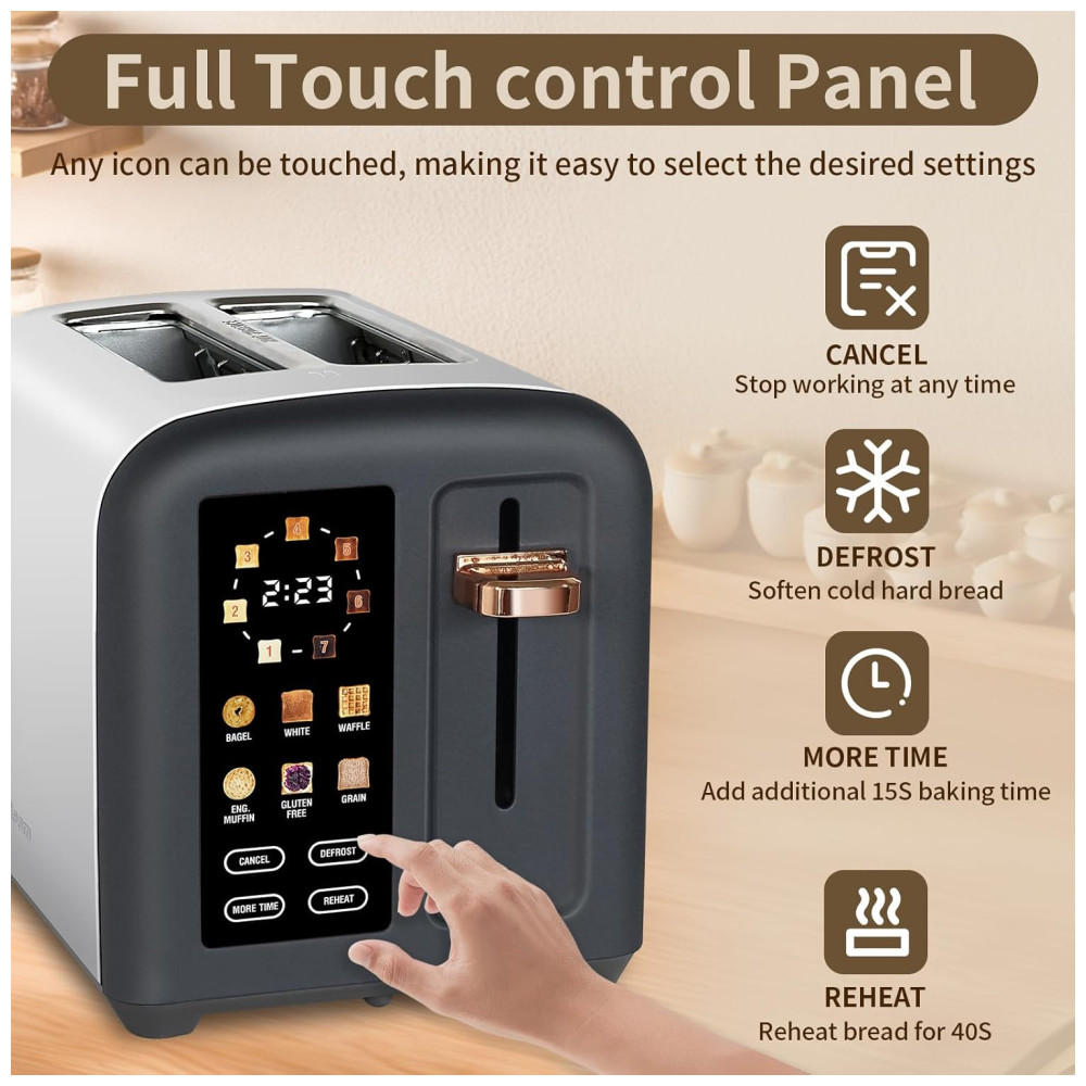 Tela LCD e controle de toque A torradeira de slots extra largos possui um grande display LCD de controle de toque colorido, para que você possa ver e selecionar o tipo de pão, a configuração da sombra e o tempo restante facilmente. Com um toque, selecione imediatamente.