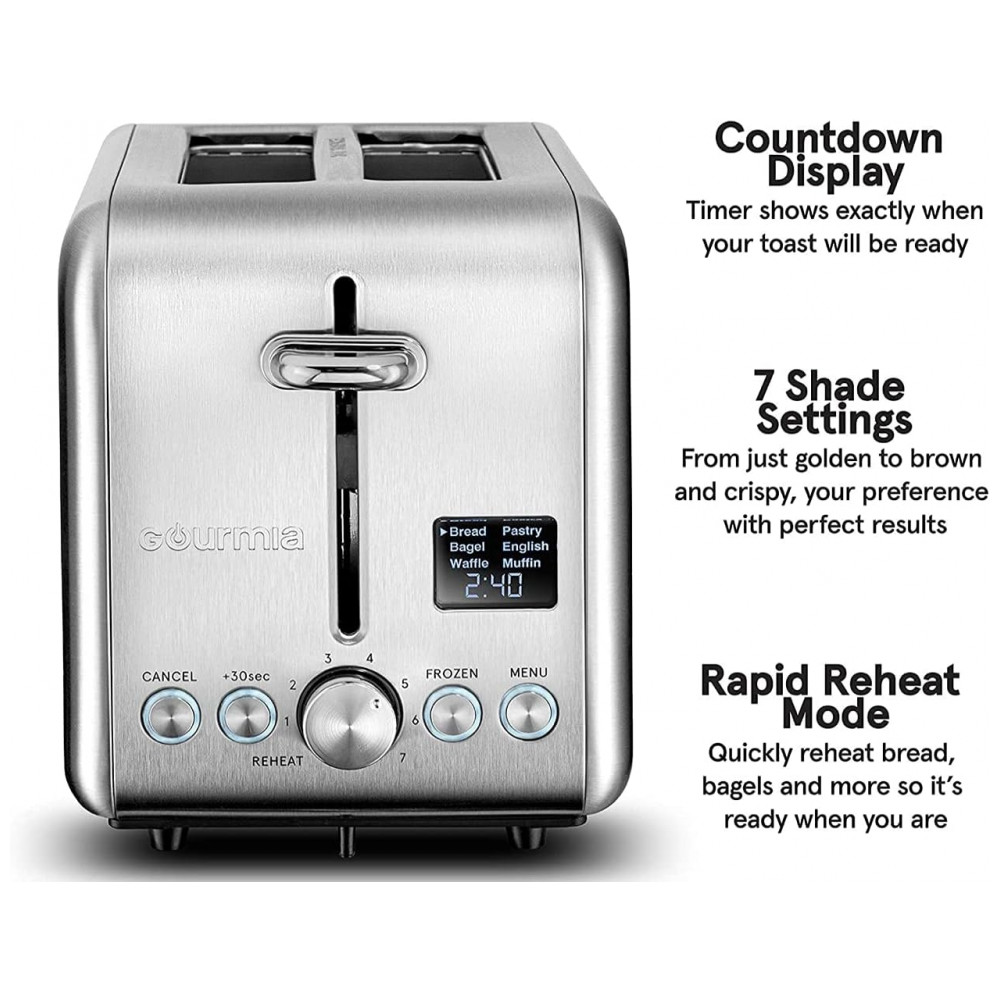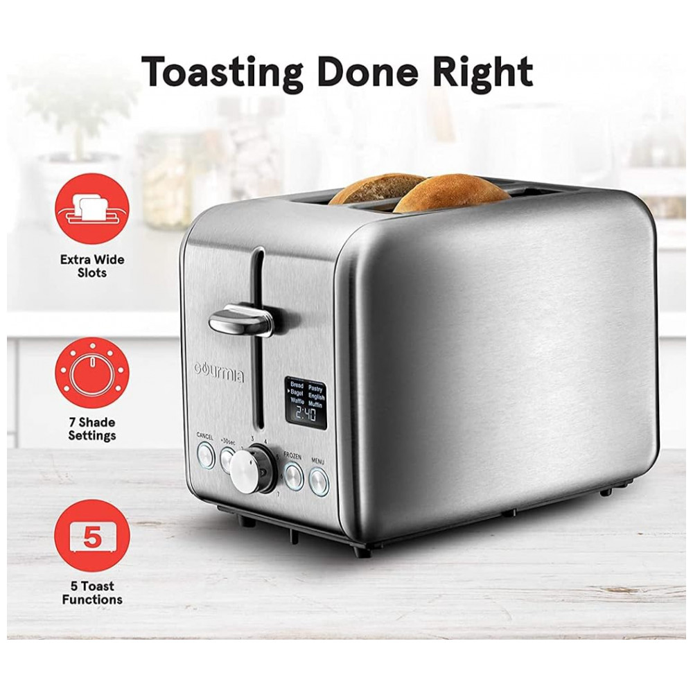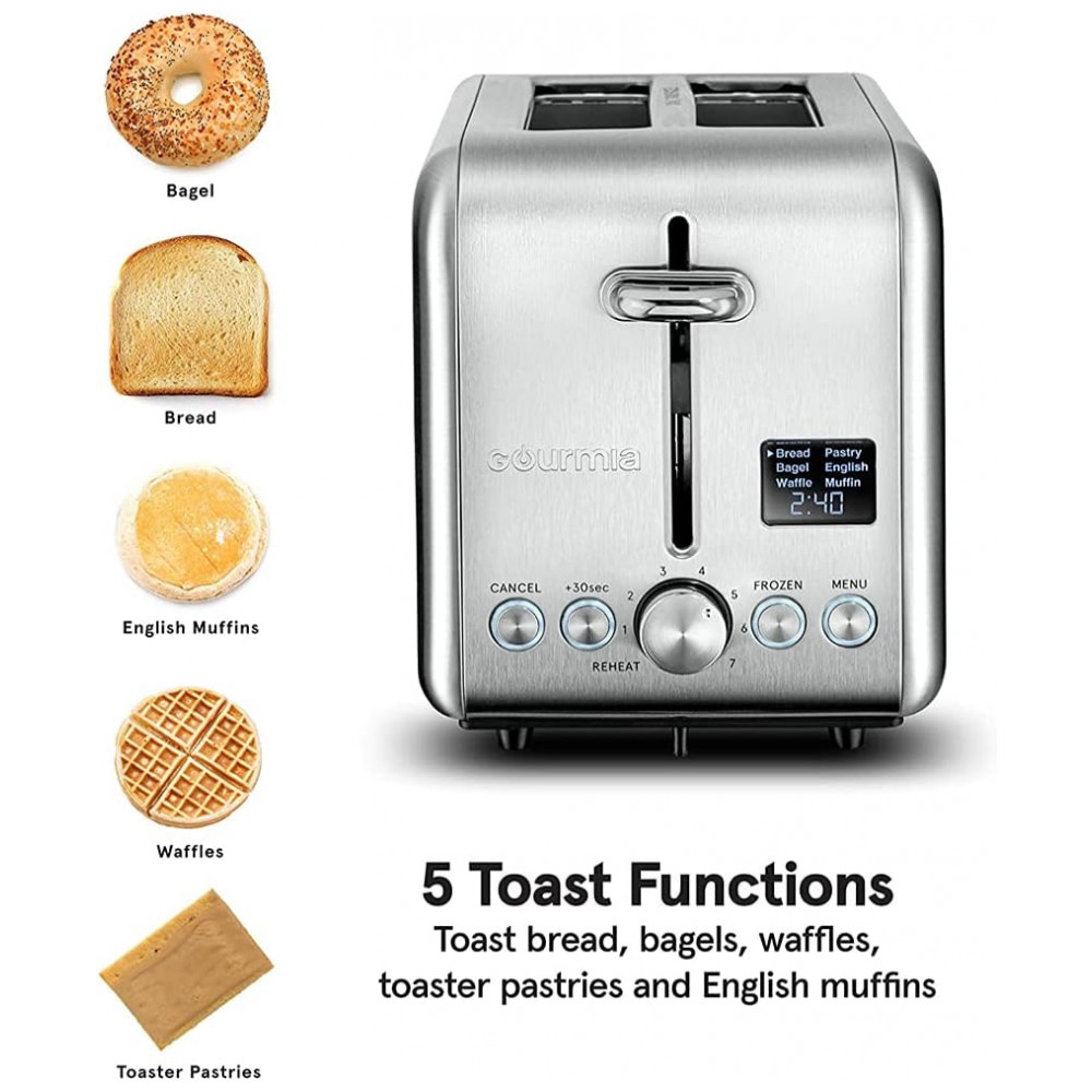 Fique bem e tostado. Desejando waffles Um bagel com manteiga ou muffin inglês Esta torradeira digital multifuncional Gourmia pode fazer tudo. Passe a manteiga. Um brinde à torrada perfeita Slots extra largos os slots se ajustam automaticamente para segurar e torrar tudo de pão fino a bagels grossos. Elegante e durável o design compacto de aço inoxidável se adapta a qualquer cozinha. Bandeja de migalhas removível desliza para fora e facilita a limpeza. Toast Boost Eleve os itens torrados, facilitando a remoção. Exibição de contagem regressiva o cronômetro mostra exatamente quando sua torrada estará pronta. Controles fáceis de definir para reaquecer, descongelar ou adicionar 30 segundos para torradas do jeito que você gosta. Brindando Bem Feito