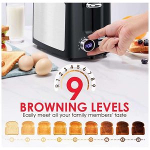 9 Forma de controle de browning ajustável Esta fatia digital de torradeira 2 está equipada com 9 controles de browning ajustáveis para personalizar a crocância do pão de 1 leve a 9 escuro . Você pode ser assado à vontade de acordo com o gosto pessoal e satisfazer as muitas preferências de sua família.