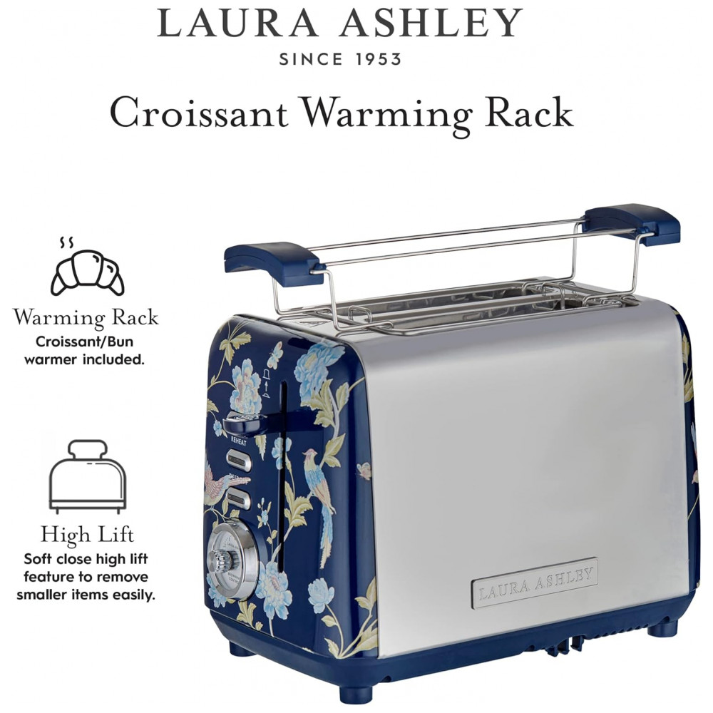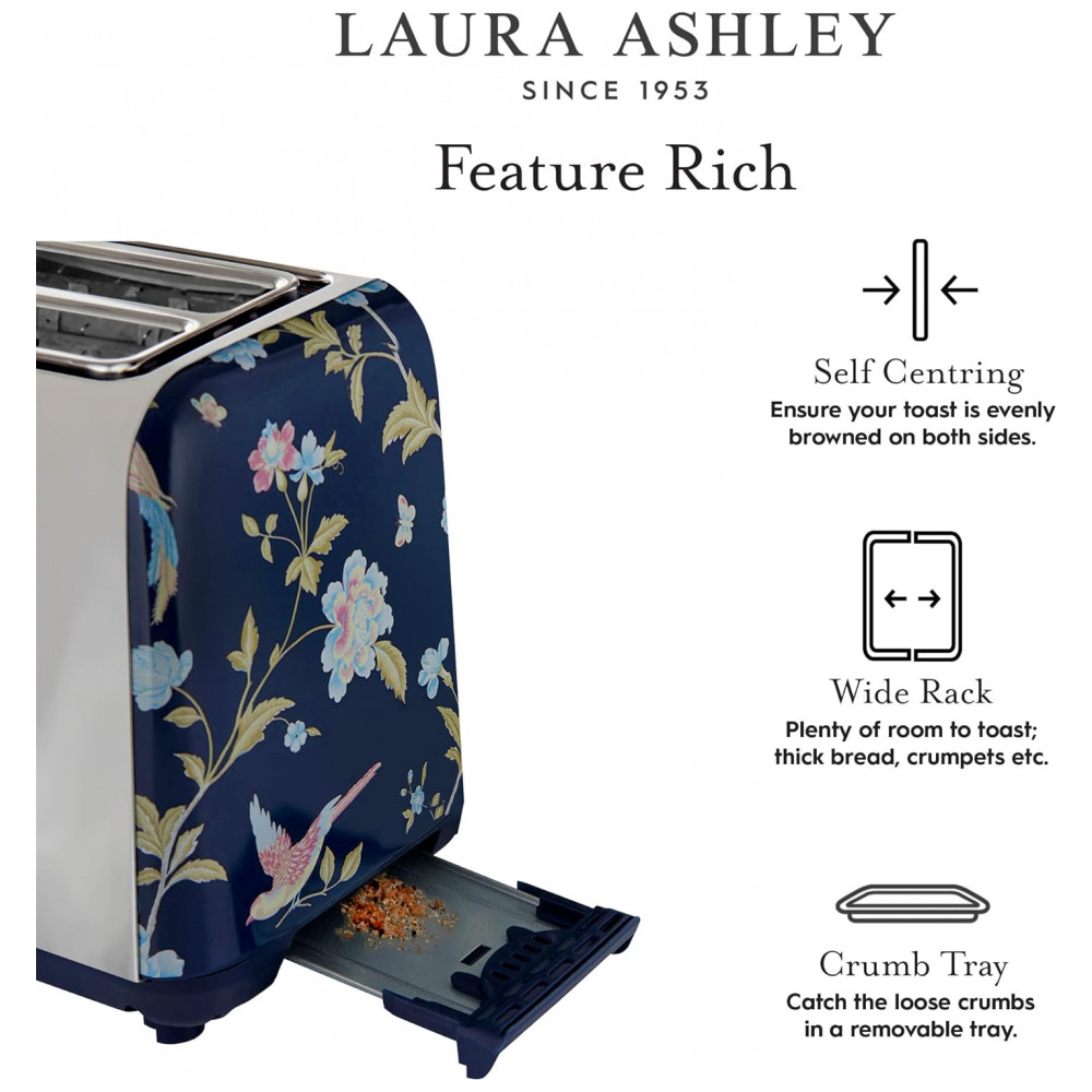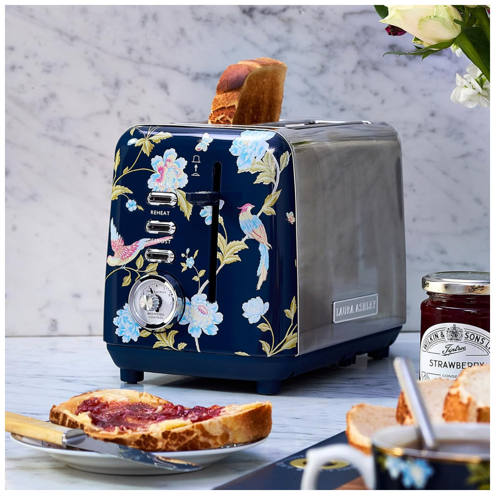Torradeira elétrica de 2 fatias em aço inoxidável com estampa Elveden azul marinho Laura Ashley, desenvolvida para torrar pães e bagels com controle preciso de douramento. Possui 7 níveis de aquecimento, slots largos com auto centralização e suporte superior para aquecer croissants ou manter as torradas aquecidas durante o preparo do café da manhã.