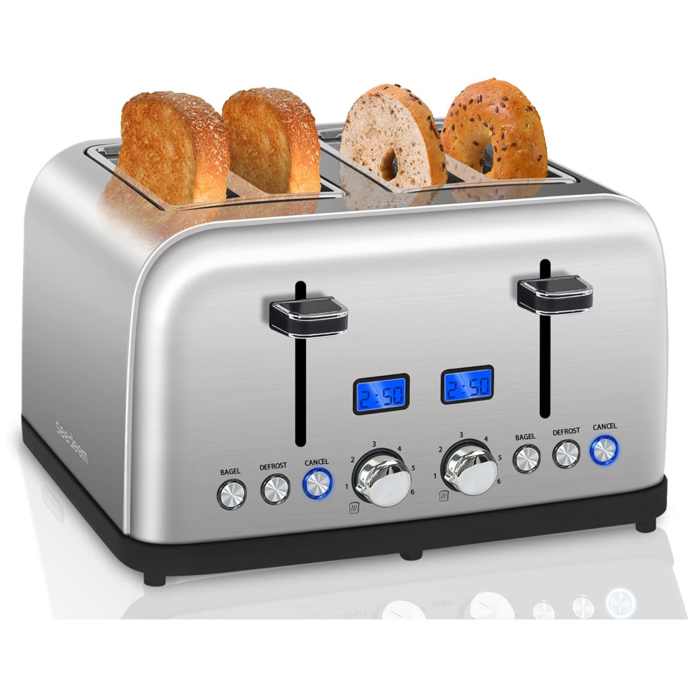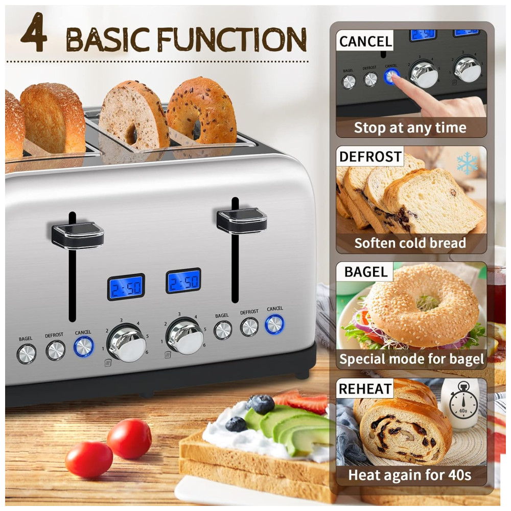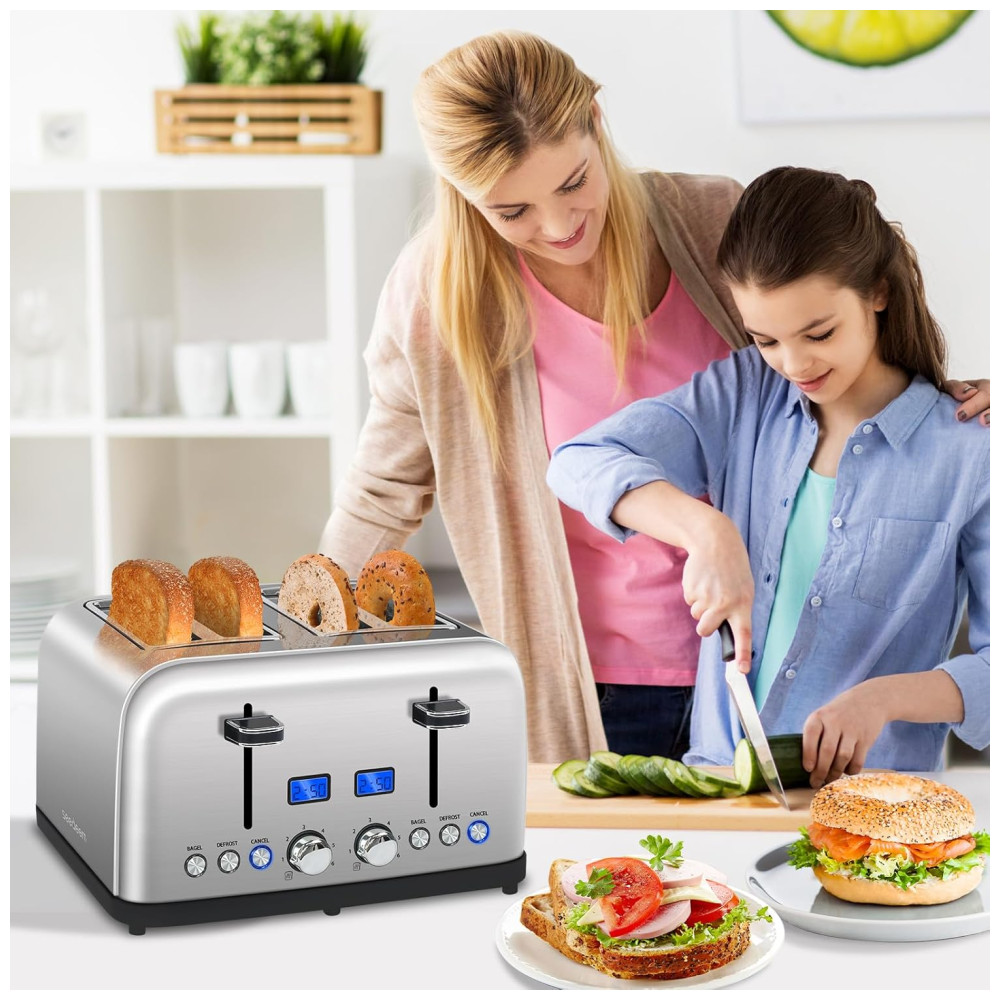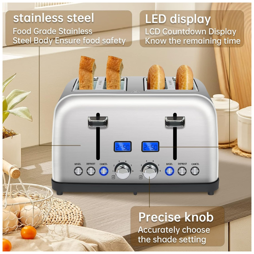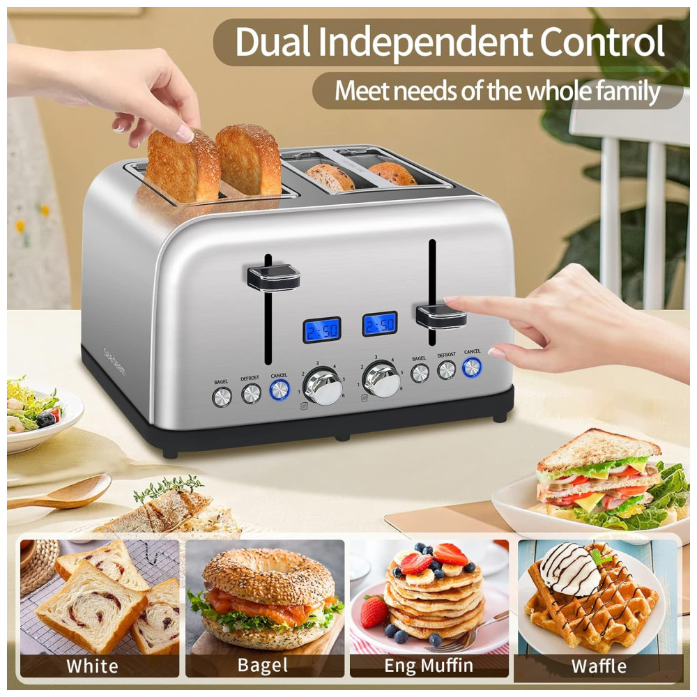 Torradeira Elétrica 4 Fatias 6 Níveis de Tostagem em Aço Inoxidável e Visor LCD 110V 1500W SEEDEEM Prata