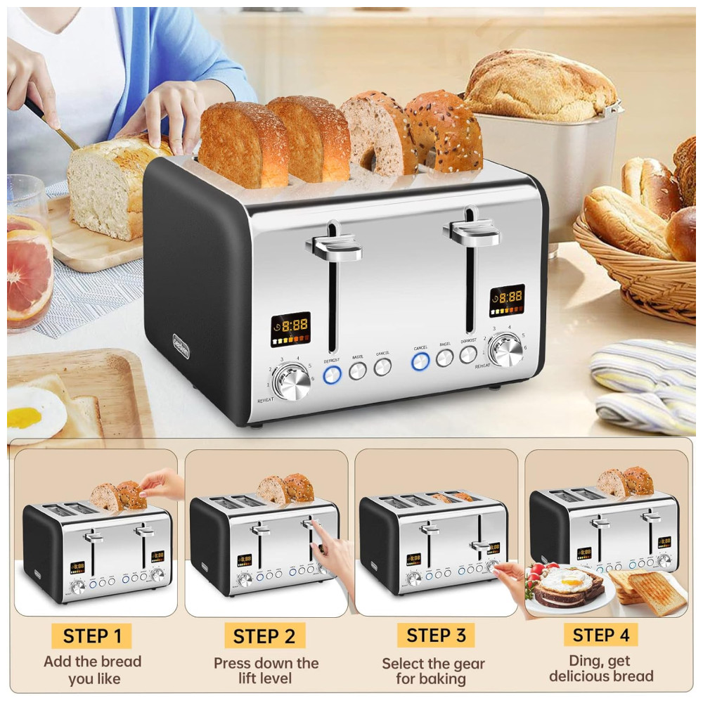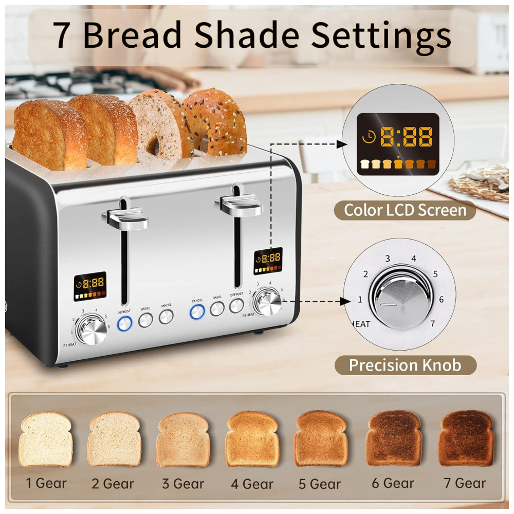 Especial Mid range 7 Bread Shade Setting fornece 7 tipos diferentes de pão, de amarelo claro a escuro profundo. Em comparação com as torradeiras normais, a nossa torradeira de aço inoxidável tem 7 configurações de tonalidade perfeitas. A configuração média especialmente desenvolvida 4 marchas, pode assar pão delicioso que não é muito seco, mas cheio de sabor queimado.