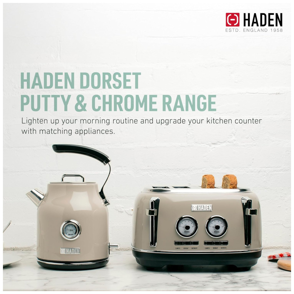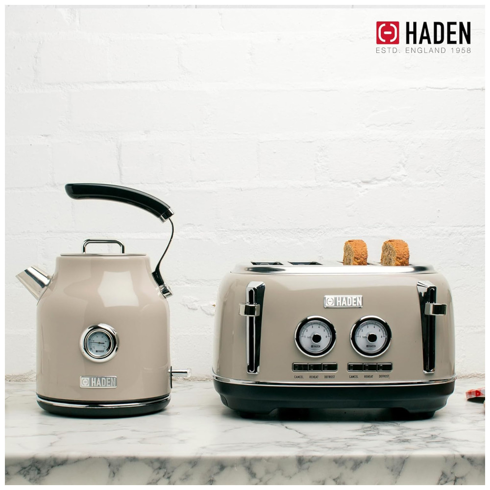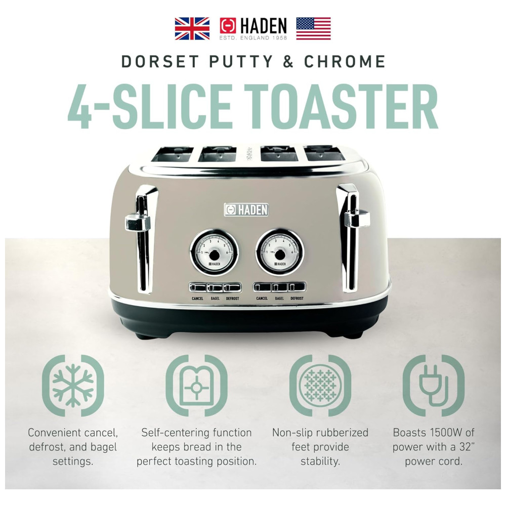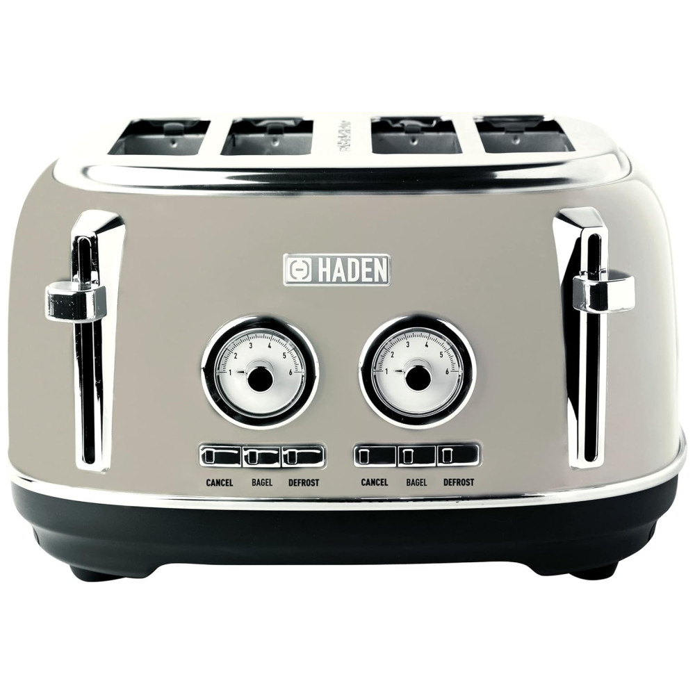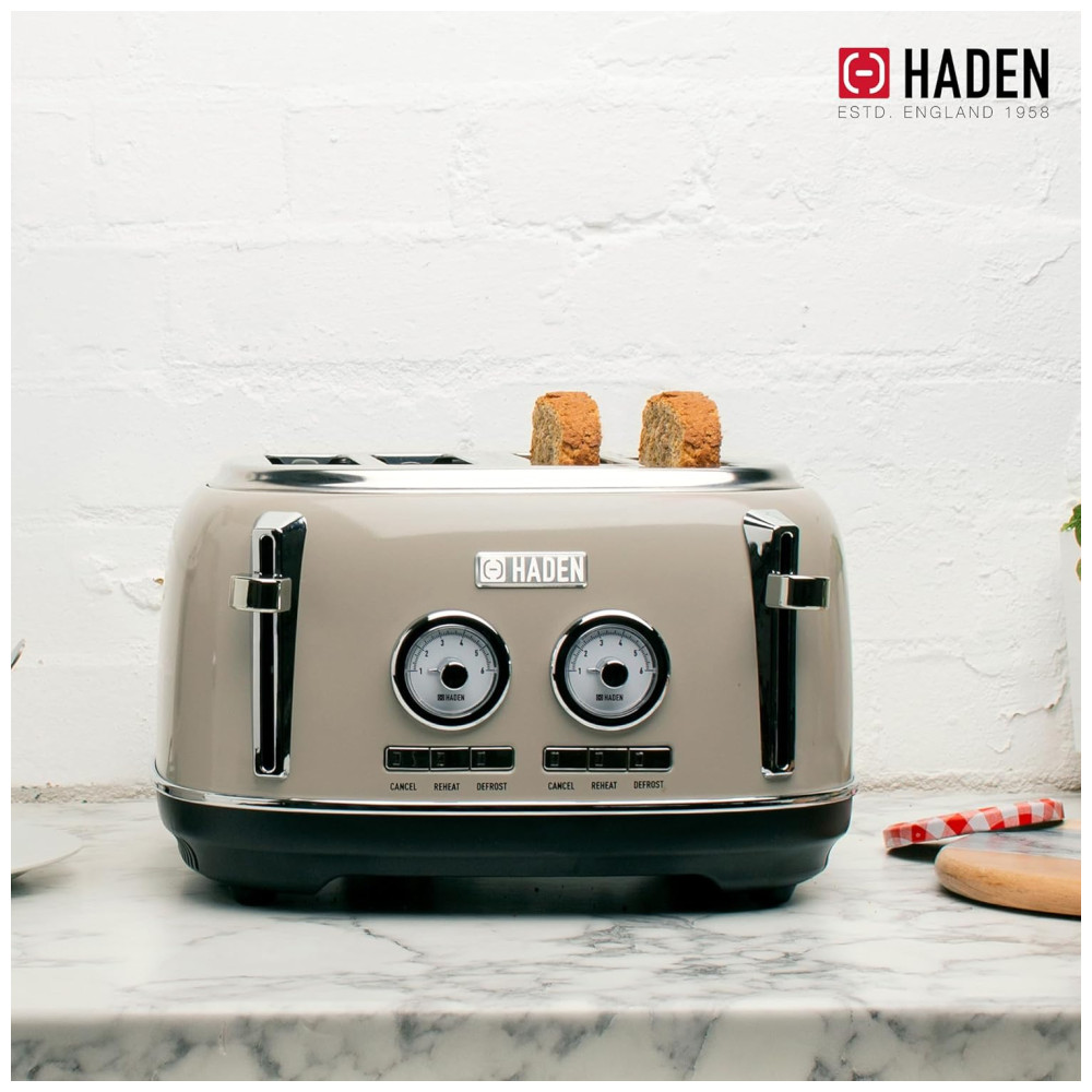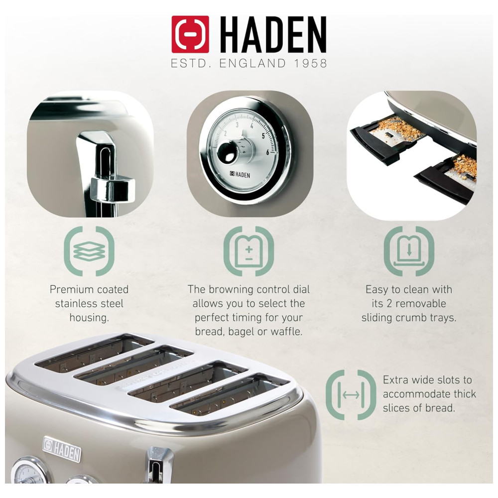 Características Torradeira de quatro fatias com slots extra largos para bagels Aço inoxidável pintado com emblema Haden, caixa de aço inoxidável pintada com emblema Haden, função autocentrante e bandeja de migalhas removível.