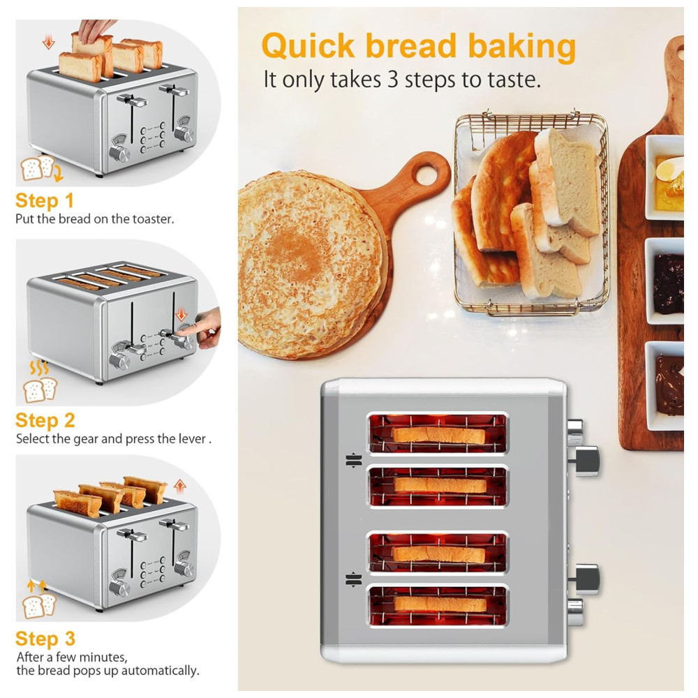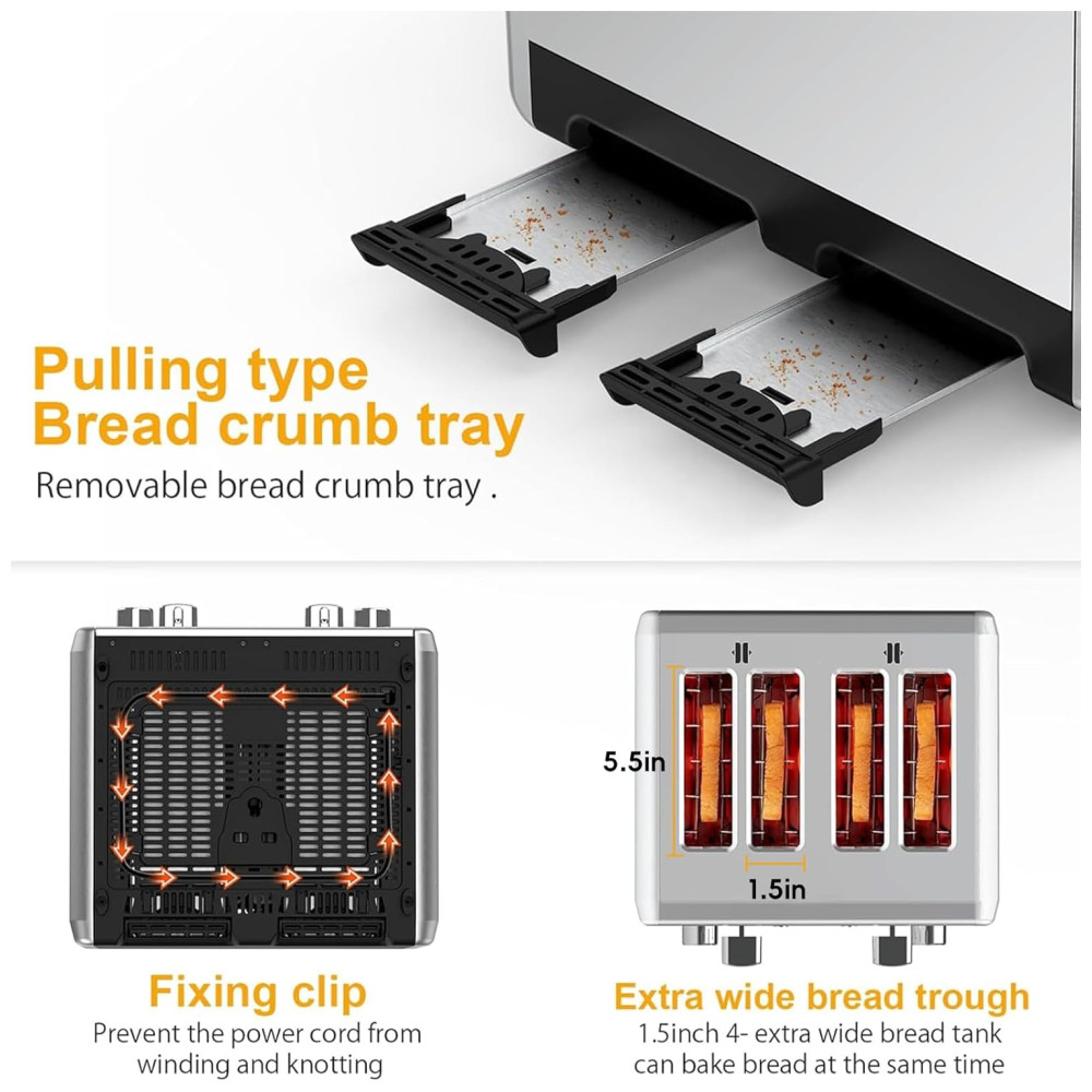Torradeira Elétrica 4 Fatias em Aço Inoxidável com 6 Níveis de Tostagem Painel de Controle Duplo e Bandeja de Migalhas Removível 1500W WHALL Prata