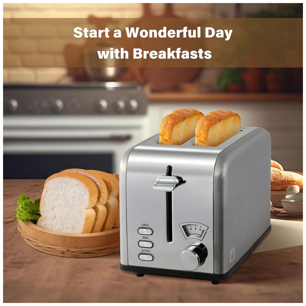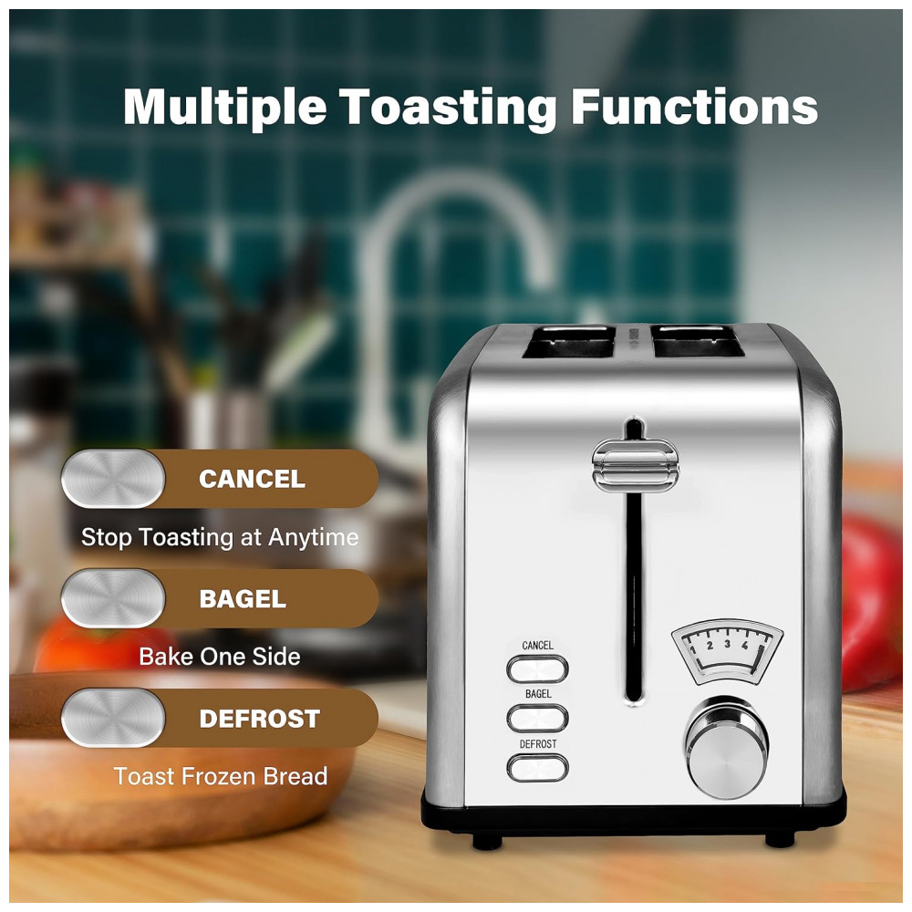 Personalizar torradas: Use o seletor de tonalidade para fazer 5 tipos de torradas mais claras a mais escuras. 3 funções atendem às suas diversas necessidades de torradas: Bagel assa apenas um lado, Descongelar torna o pão congelado macio, Cancelar ajuda você a parar a qualquer momento.