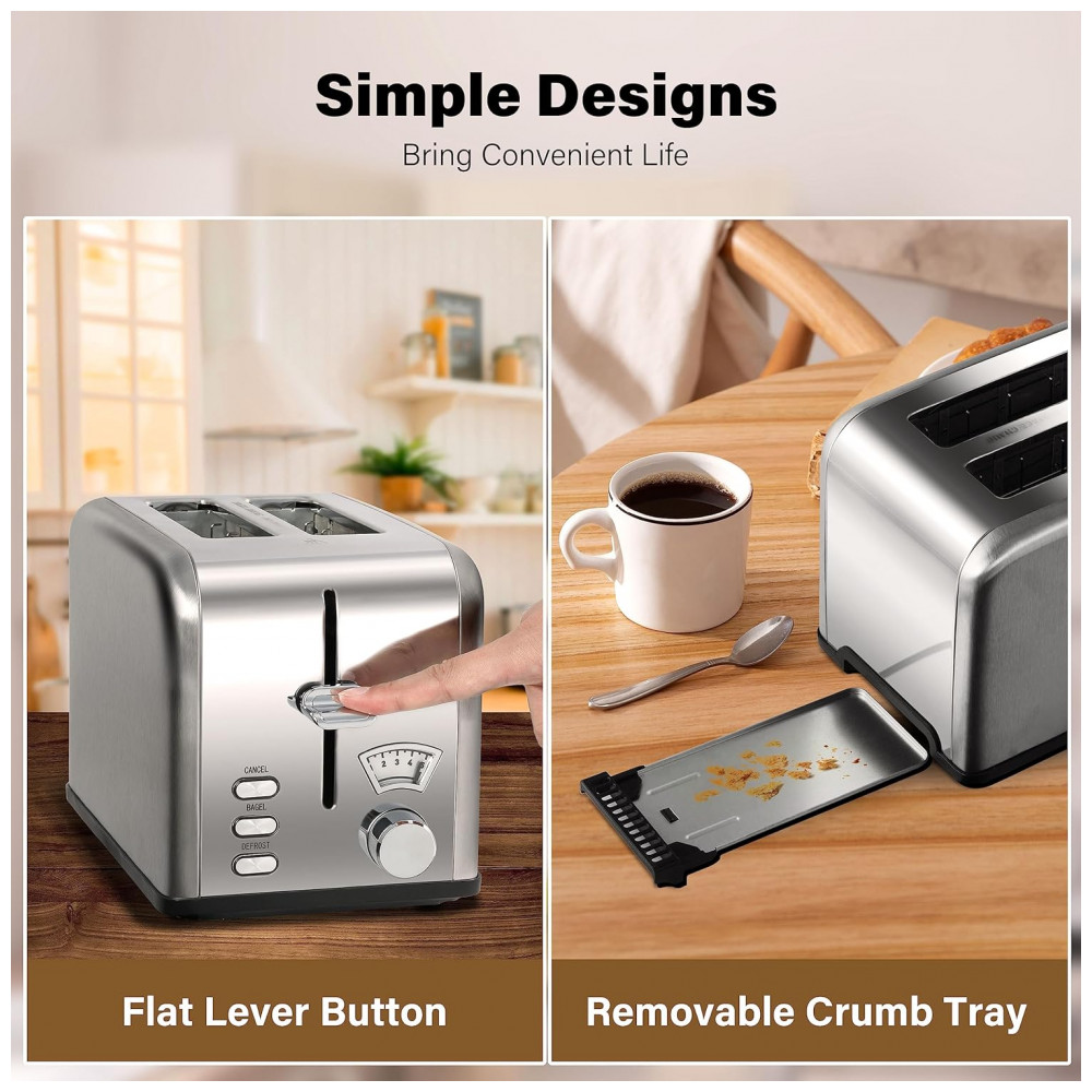 Vantagem: Slot de 3 centímetros de largura mais largo do que muitas outras torradeiras de 2 fatias, cabe em pão e bagel mais grossos. Remova e descarte convenientemente as migalhas do fundo com a bandeja removível de migalhas, fácil de limpar. O zenamento de cabo embutido manterá a desordem no mínimo.