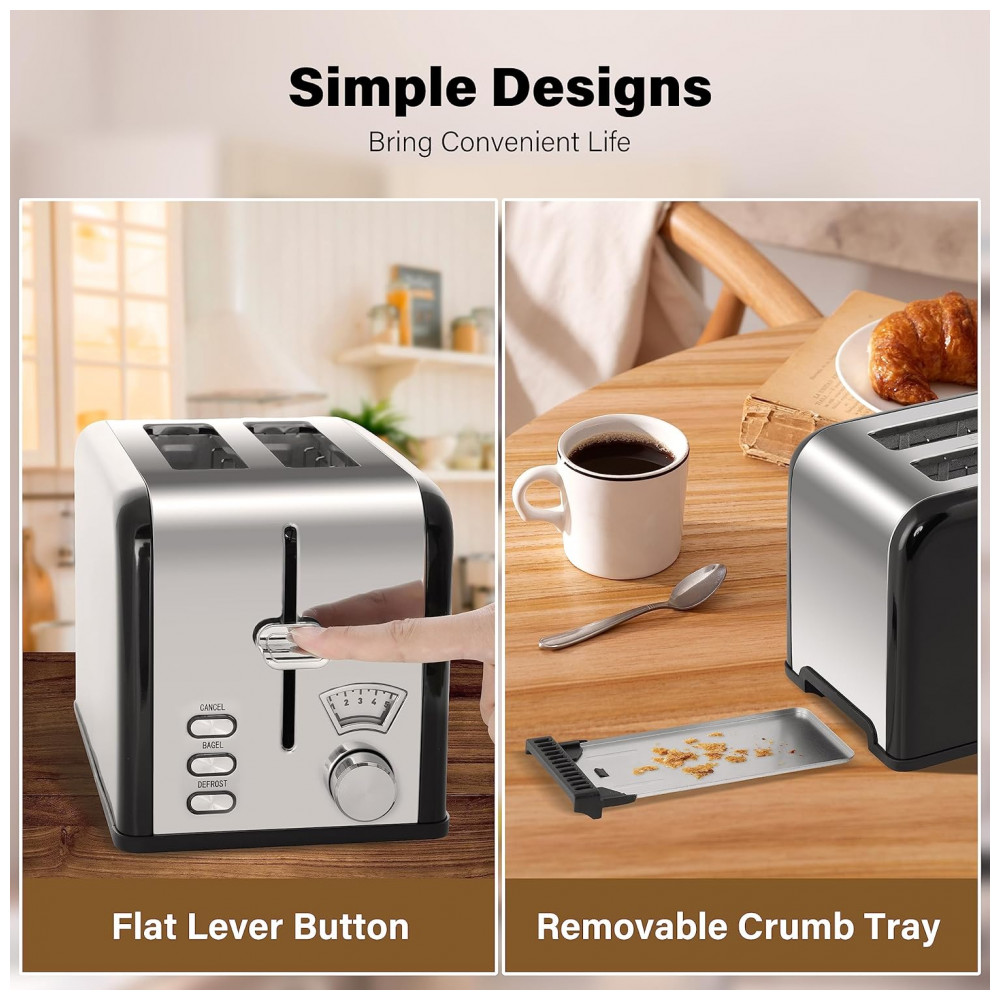Vantagem: Slot de 3 centímetros de largura mais largo do que muitas outras torradeiras de 2 fatias, cabe em pão e bagel mais grossos. Remova e descarte convenientemente as migalhas do fundo com a bandeja removível de migalhas, fácil de limpar. O zenamento de cabo embutido manterá a desordem no mínimo.