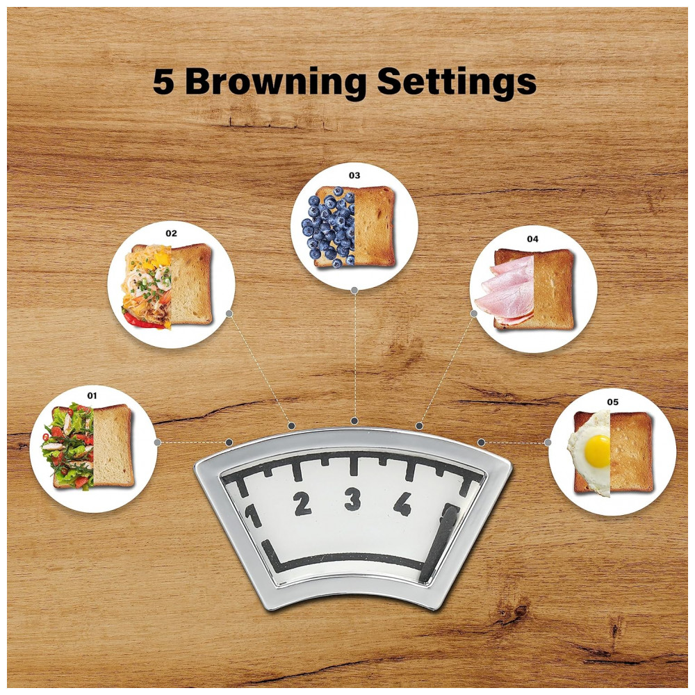 Personalizar torradas: Use o seletor de tonalidade para fazer 5 tipos de torradas mais claras a mais escuras. 3 funções atendem às suas diversas necessidades de torradas: Bagel assa apenas um lado, Descongelar torna o pão congelado macio, Cancelar ajuda você a parar a qualquer momento.