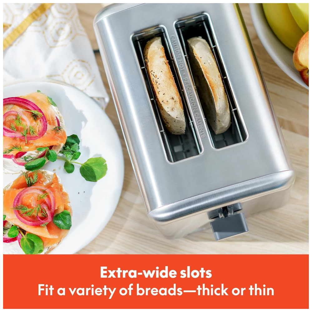 Compartimentos extra largos esta torradeira possui aberturas extra largas que se encaixam facilmente em bagels grossos, pães artesanais, torradas estilo Texas e muito mais As guias autocentralizadas garantem o cozimento uniforme e uma alavanca de elevação alta permite fácil acesso.