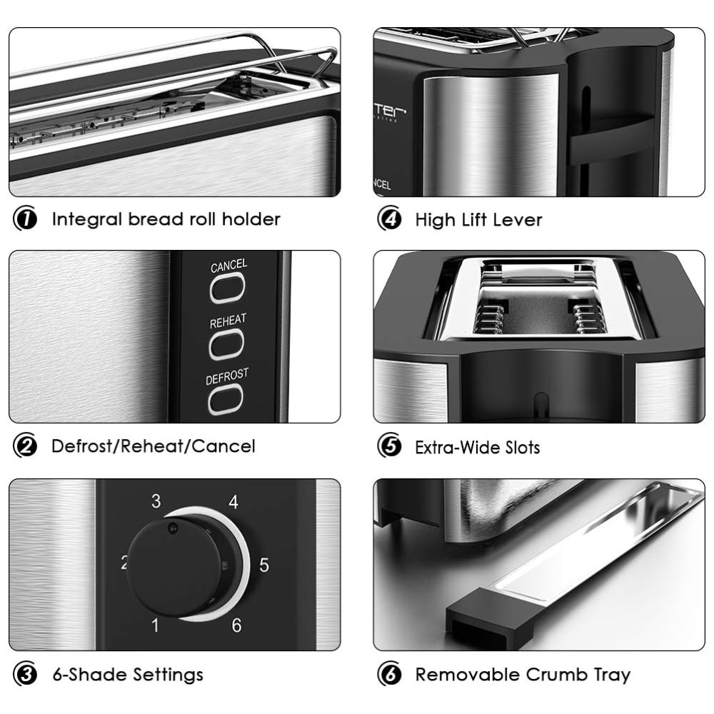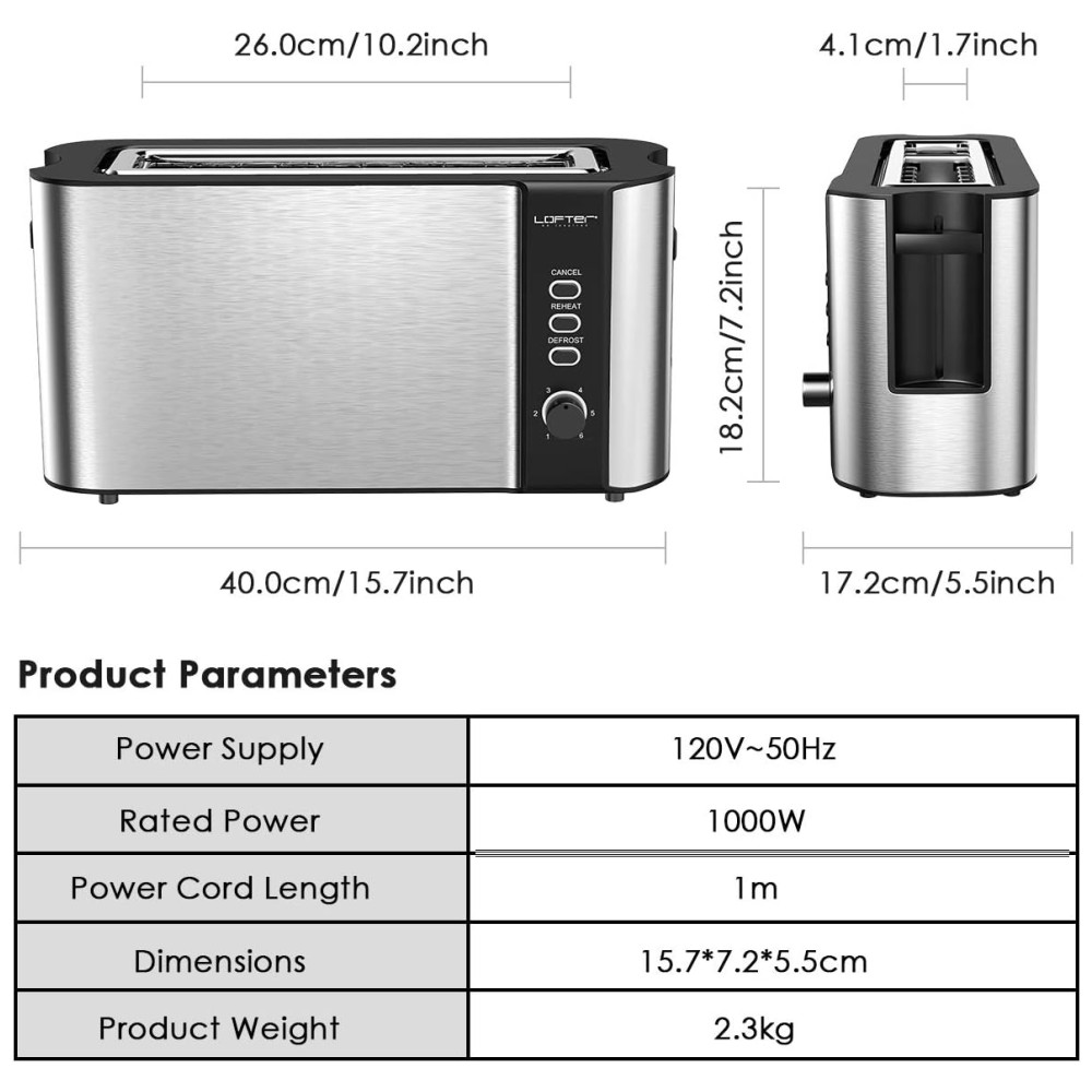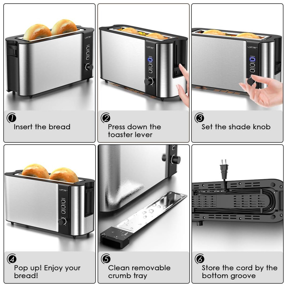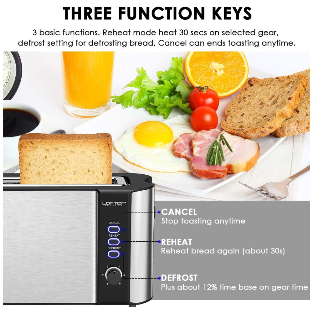 Torradeira LOFTER de aço inoxidável com configurações de tonalidade variáveis permitem que você decida o grau certo de torrar para você, escolhendo desde uma fatia tostada levemente dourada a escura profunda de 1 claro a 6 escuro engrenagem acomodada por preferências individuais. Nota 3 funções básicas descongelar, reaquecer e cancelar. O modo de degelo mais 30 segundos, o modo de reaquecimento aquece 30 segundos na engrenagem selecionada e o Cancelar pode parar de torrar a qualquer momento.