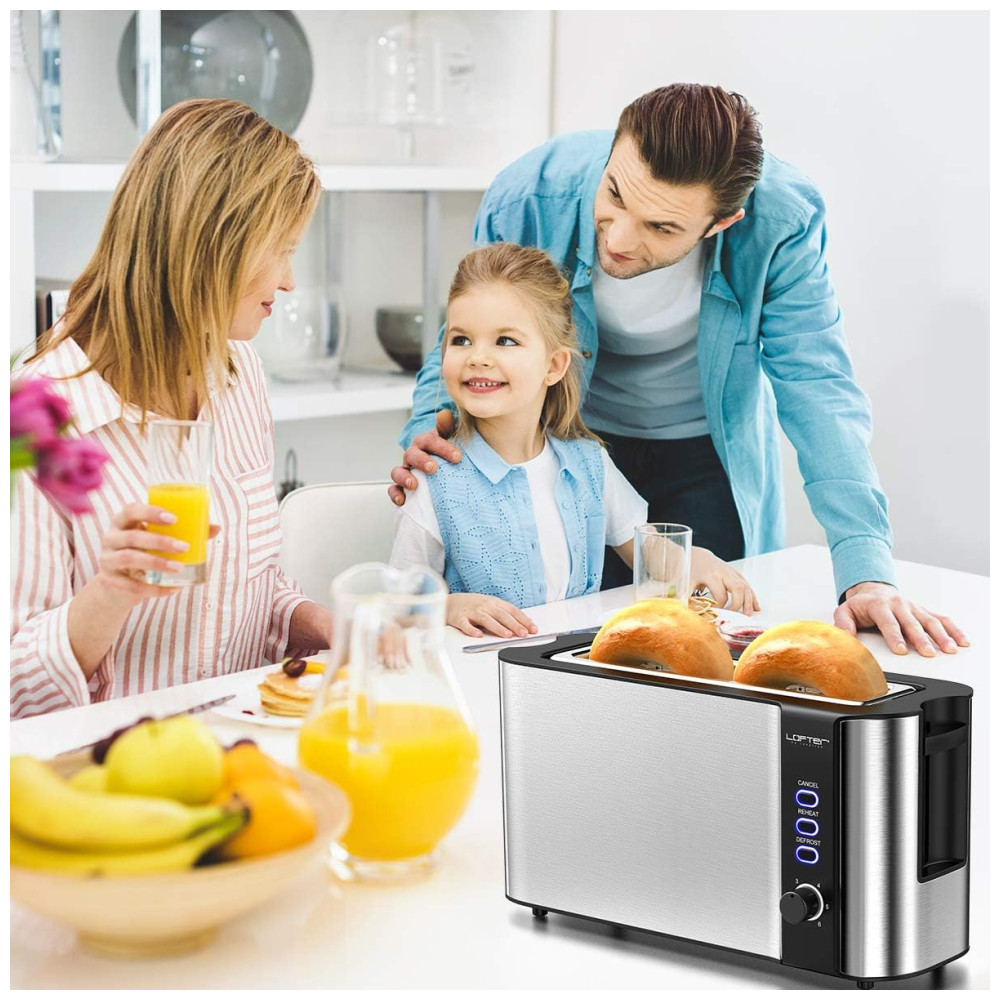 SLOTS EXTRA LARGOS DE Torradeira LOFTER 2 mede de comprimento por de largura com guias de ajuste, tornando a adequada para vários tipos de pão, como waffles finos ou pão artesanal grosso, e sempre mantenha os pães na melhor posição para torrar .Ele também equipado com função de pop up automático quando a comida estiver pronta.
