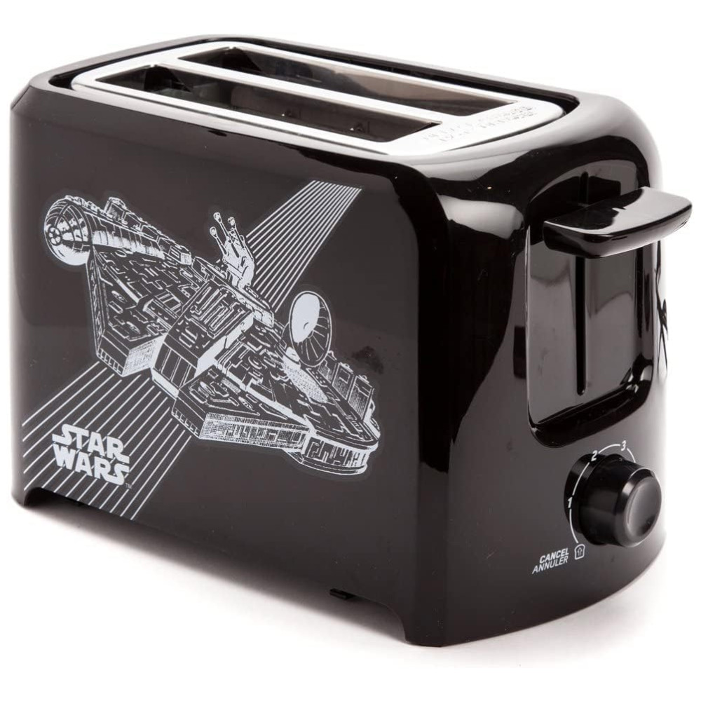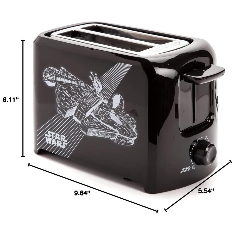 Nome do estilo Torradeira de duas fatias de Star Wars Não é necessário nenhum treinamento jedi para fazer torradas de Star Wars. Esta torradeira de 2 fatias apresenta gráficos extraordinários do Millenium Falcon e de um caça TIE. O pão é torrado com uma leve impressão do ícone da Aliança Rebelde ou do Império Galáctico. Slots largos e guias autocentrantes permitem torrar muitos tipos de pão