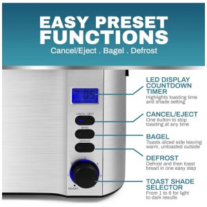 6 níveis de brinde ajustáveis com visor de LED para selecionar a persiana perfeita para o seu pão com o cronômetro de contagem regressiva.