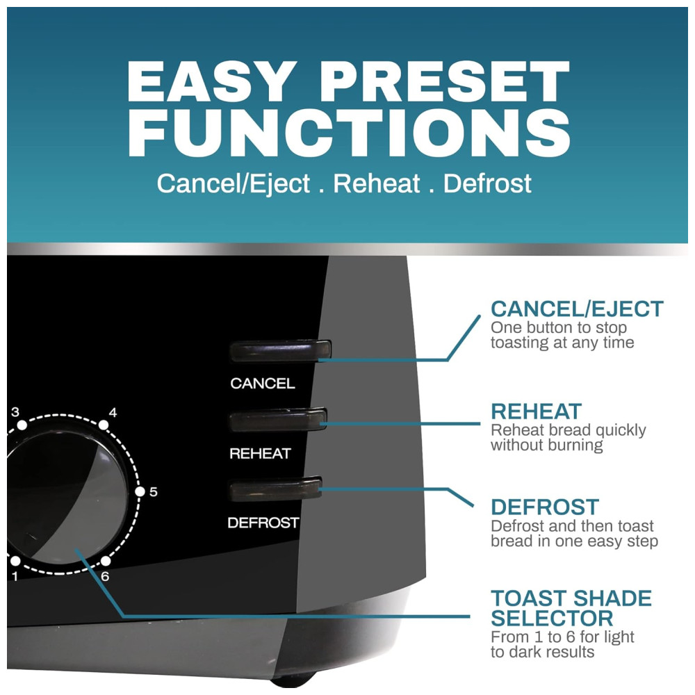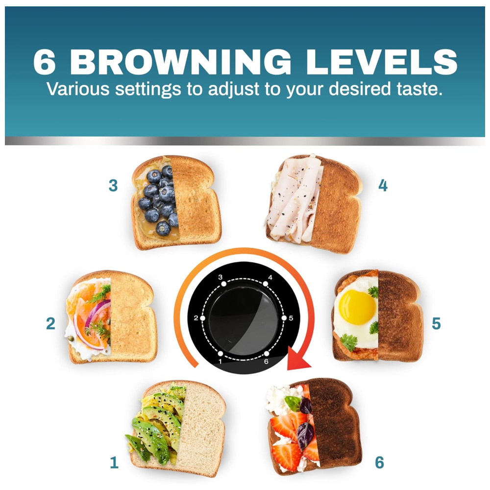 Configurações de torradeira de ajuste rápido Esta torradeira de cozinha premium possui 6 configurações de sombra variáveis para permitir que você crie pão leve, médio ou crocante em minutos.