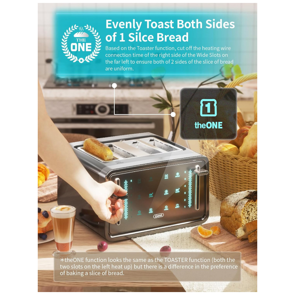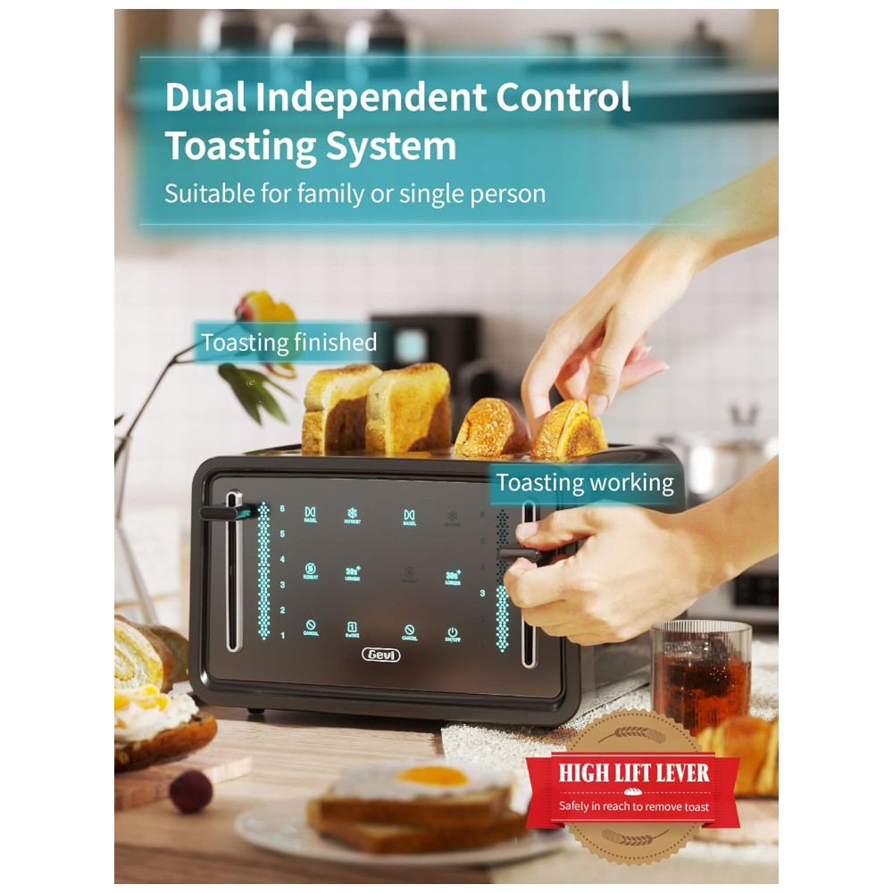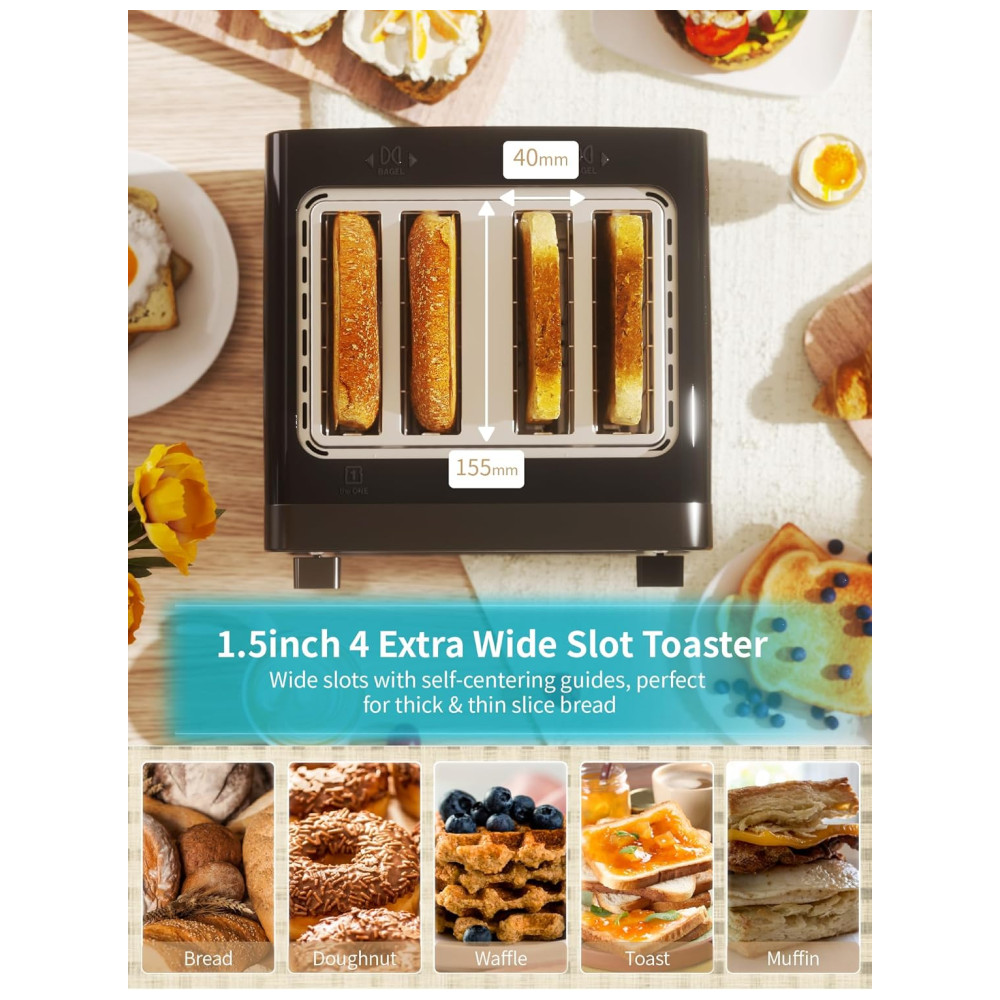 4 SLOTS DE TORRAR PÃO EXTRA WIDE Design de metal de aço inoxidável, moderno e compacto. Leva apenas dois ou três minutos para assar o pão e a abertura extra larga é projetada para assar pães de diferentes tamanhos. Quatro slots para torrar com duas unidades independentes, uma alça controla dois slots e quatro slots podem ser controlados de forma independente ou em conjunto. Você pode escolher as duas combinações que desejar e fazer quantas torradas você precisar de uma vez. Seja mais rápido e conveniente