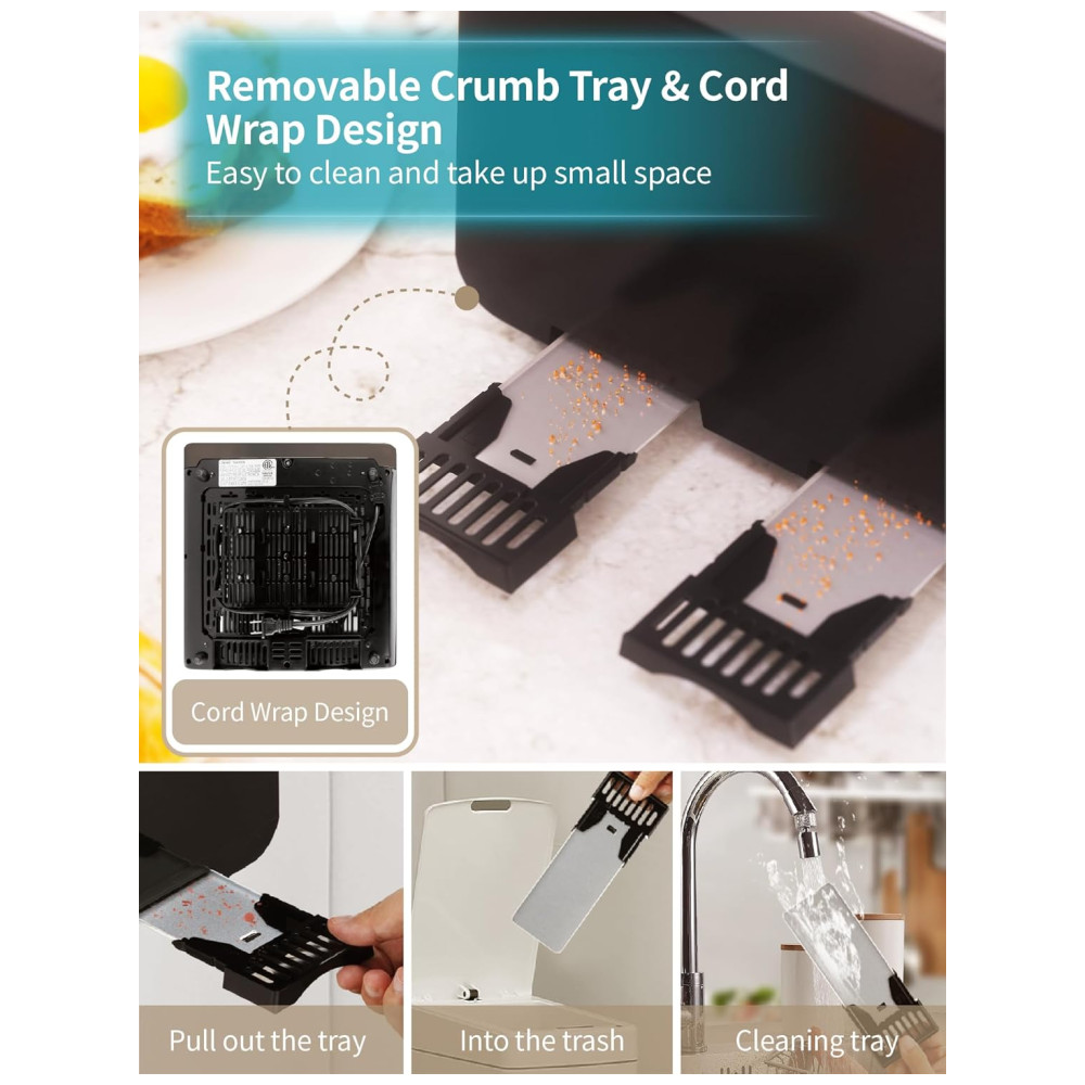 DESIGN HUMANIZADO PARA FÁCIL USO Existem duas alças do carro com controle independente em cada lado, enquanto o pão foi torrado na cor predefinida, as alças do carro serão restauradas automaticamente à posição . Quando você seleciona uma das três funções básicas, a tecla de função correspondente será exibida por uma luz LED. Na parte inferior da torradeira existem duas torradeiras removíveis para facilitar a limpeza e a parte inferior da torradeira pode receber fios para fácil zenamento