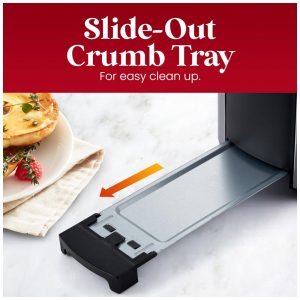 DESLIZE A BANDEJA DE MIGALHAS E ZENAMENTO DE CABO para limpeza rápida e fácil de migalhas e detritos e sem cabos desagradáveis.