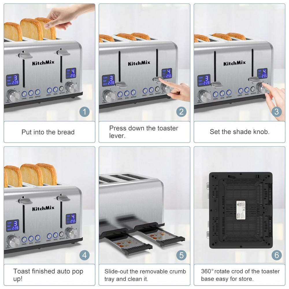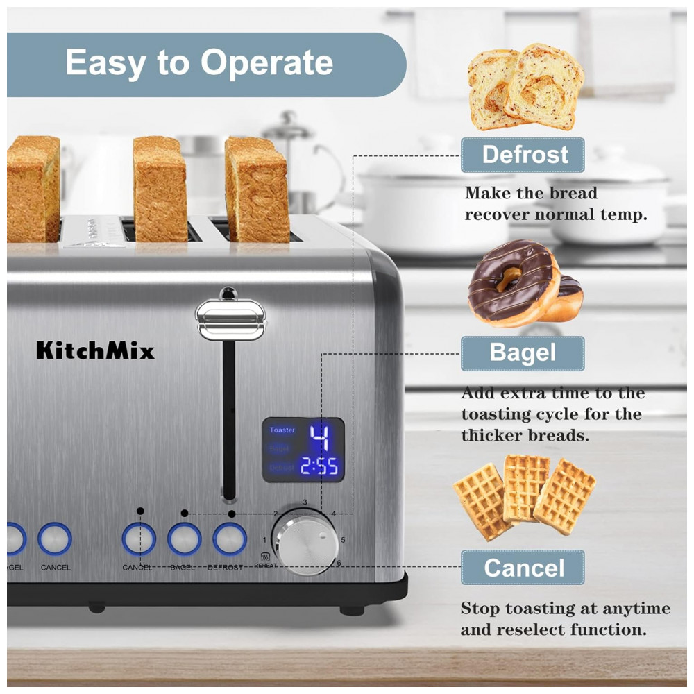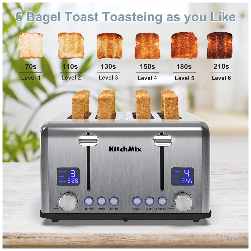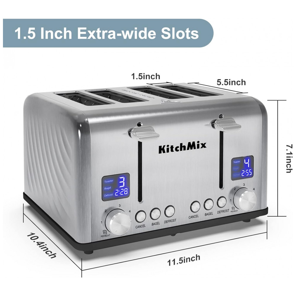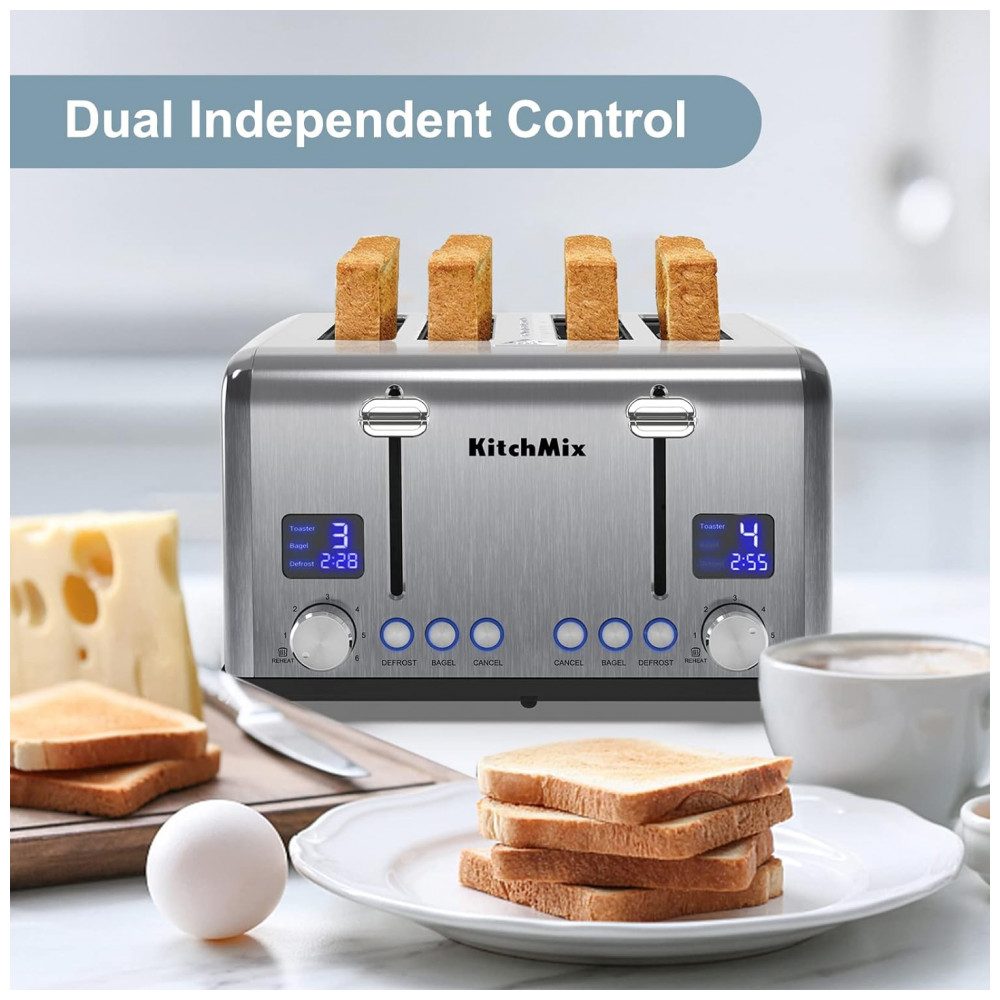Torradeira Elétrica de 4 Fatias em Aço Inoxidável e Temporizador LCD 110V 1650W KitchMix Prata
