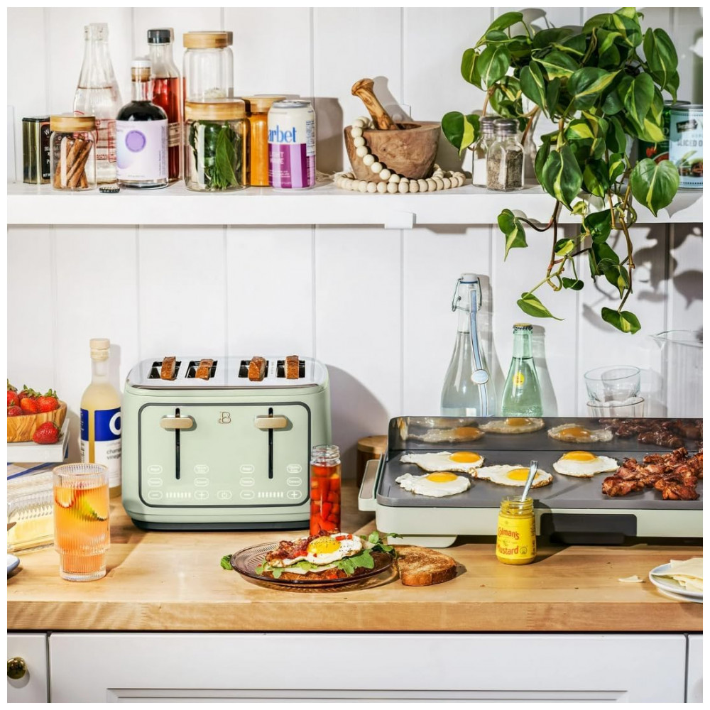 A torradeira elétrica de 4 fatias Beautiful Verde foi projetada para uso em cozinhas residenciais, unindo acabamento em aço inox com painel touch para controle das funções de tostagem. Os quatro slots extralargos autoajustáveis acomodam diferentes tipos de pães, incluindo fatias mais espessas e bagels, permitindo uso versátil no preparo diário.