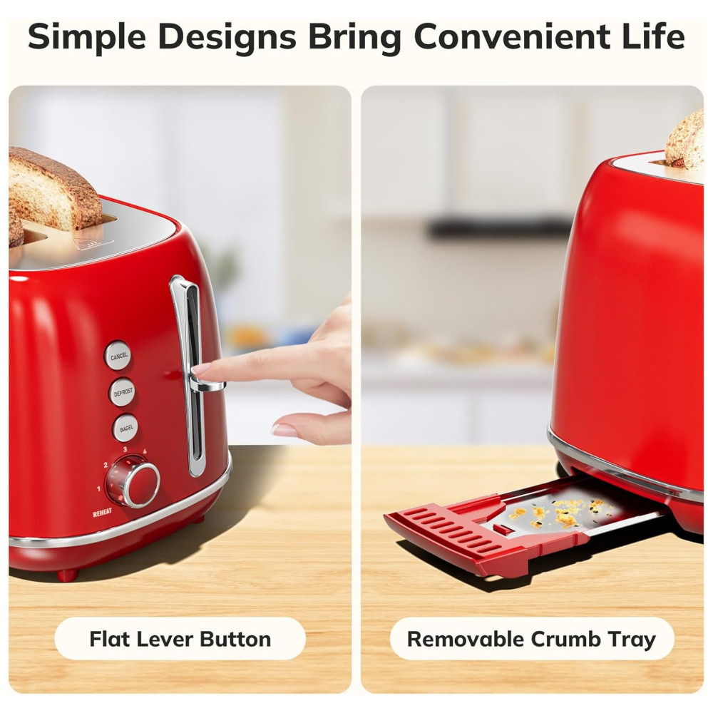 A torradeira Keenstone retro vermelha une eficiência e charme vintage em uma estrutura feita de inox 18/8. Conta com duas fendas extralargas de 3,8 cm para pães, bagels ou torradas grossas e oferece seis opções de tostagem. Dispõe de funções automáticas para bagel (tostagem unilateral), descongelar e cancelar, além de bandeja coletora removível e alavanca de alta elevação para fácil retirada do pão. O acabamento vermelho brilhante, sistema para organizar o fio, base antiderrapante e proteção contra superaquecimento garantem praticidade e segurança no uso diário. Produto livre de BPA, ideal para cafés da manhã variados em cozinhas modernas ou clássicas.