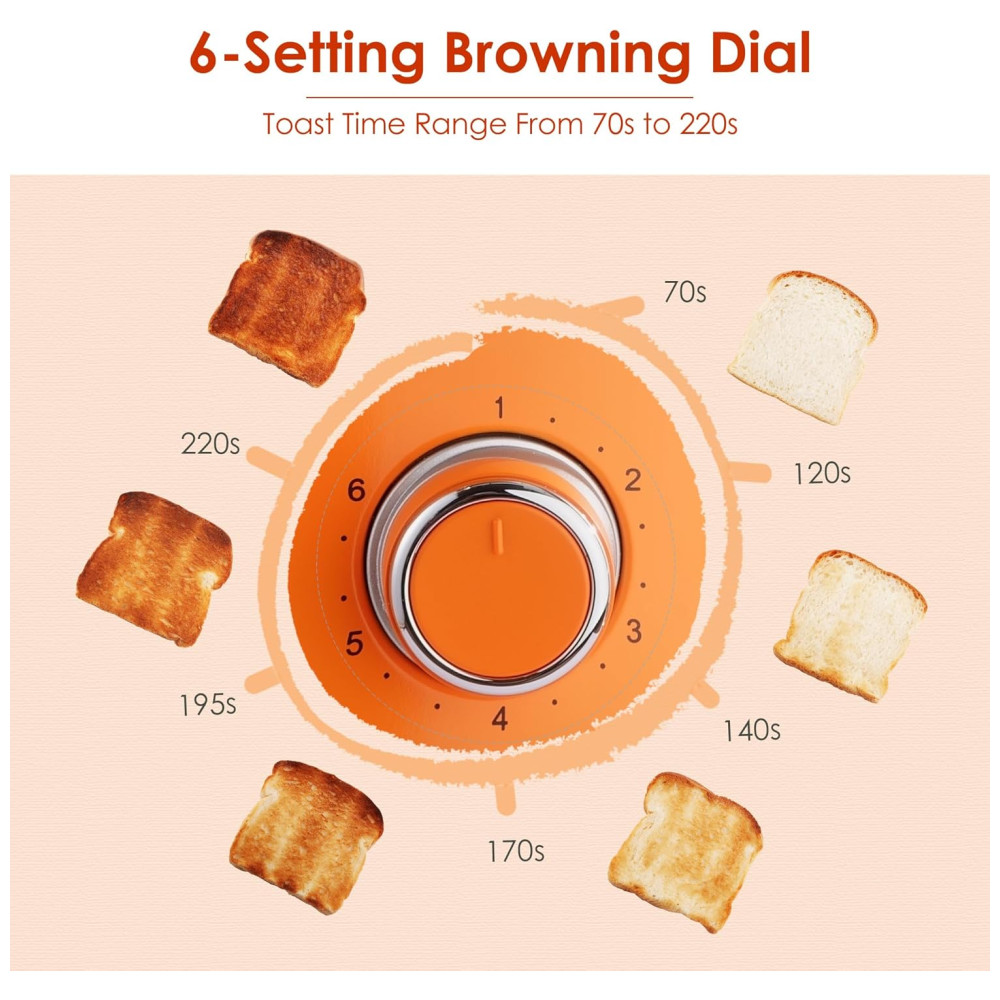 A torradeira Roter Mond de 2 fatias possui corpo em aço inoxidável 18/8 de grau alimentício, garantindo durabilidade, resistência à ferrugem e facilidade de limpeza. Seu design retrô na cor laranja com acabamento brilhante traz charme e estilo ao ambiente. Oferece 6 níveis ajustáveis de tostagem com controle analógico, variando o tempo de 70 a 220 segundos para atender diferentes preferências de douramento do pão. Conta com três funções práticas: modo bagel para aquecimento em um lado, função cancelar para interrupção imediata do processo, e função descongelar ideal para pães congelados.