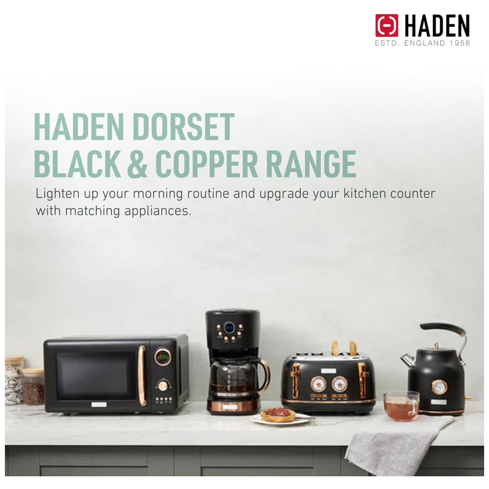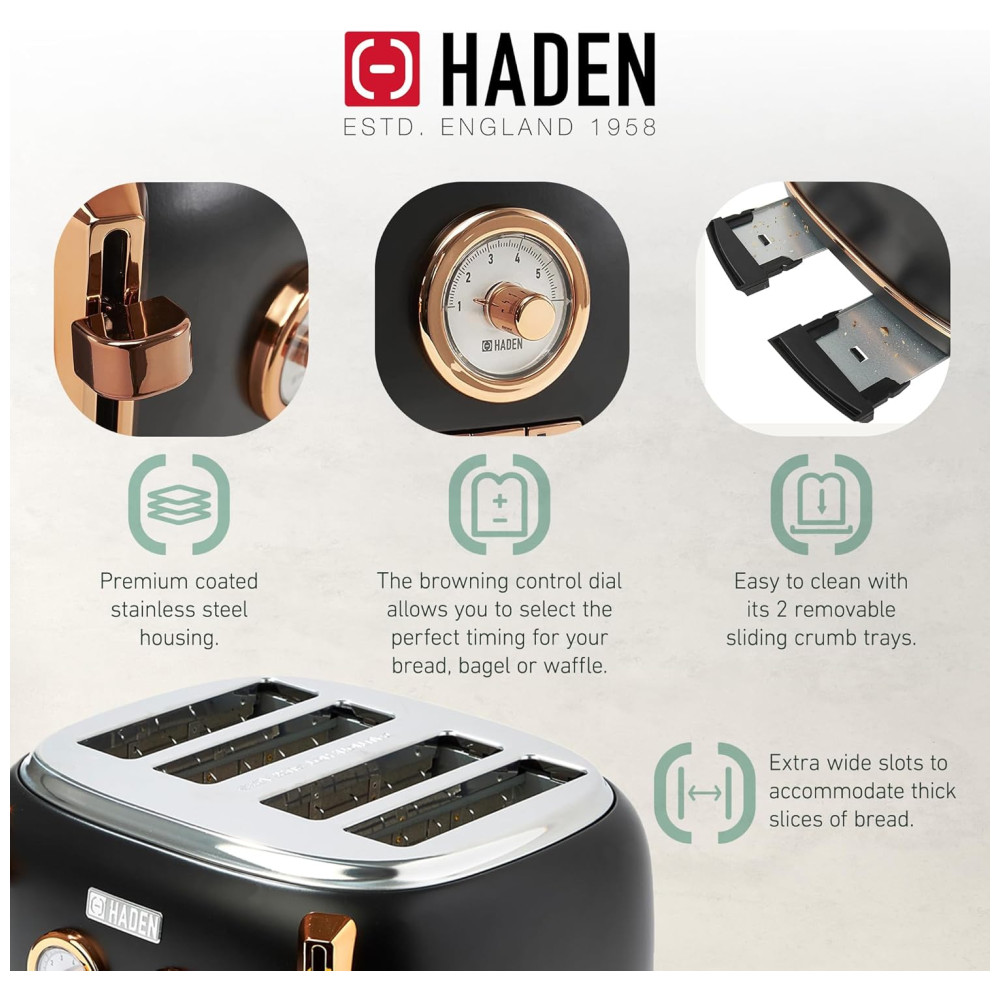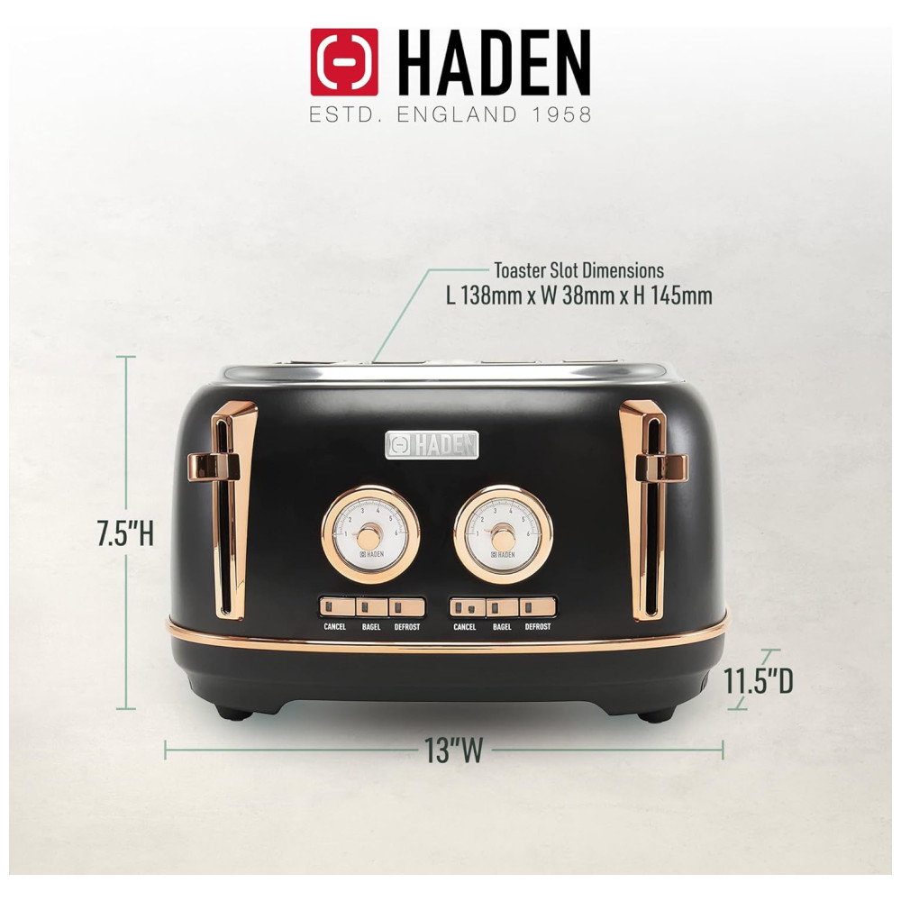 Características Torradeira de quatro fatias com slots extra largos para bagels Aço inoxidável pintado com emblema Haden, caixa de aço inoxidável pintada com emblema Haden, função autocentrante e bandeja de migalhas removível.