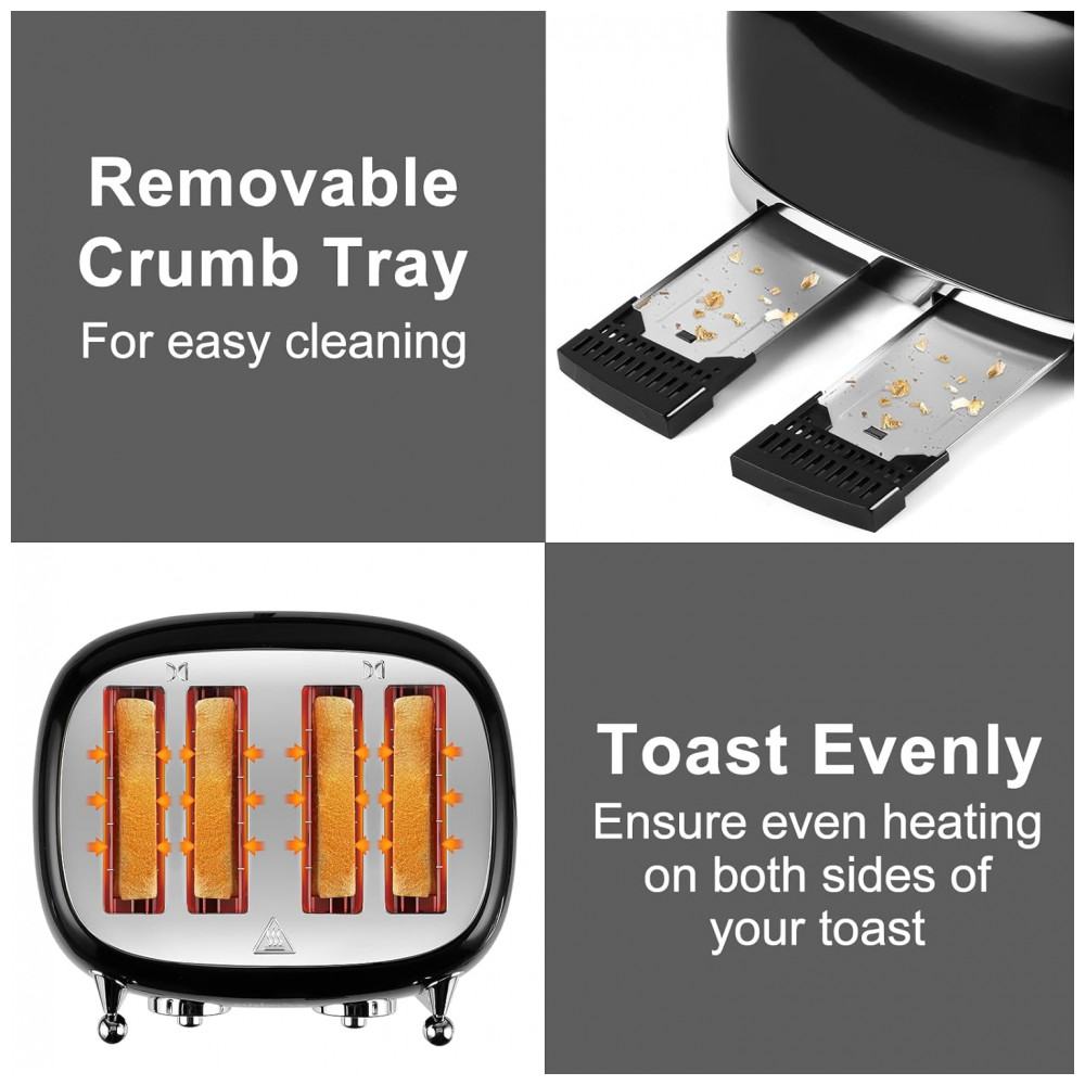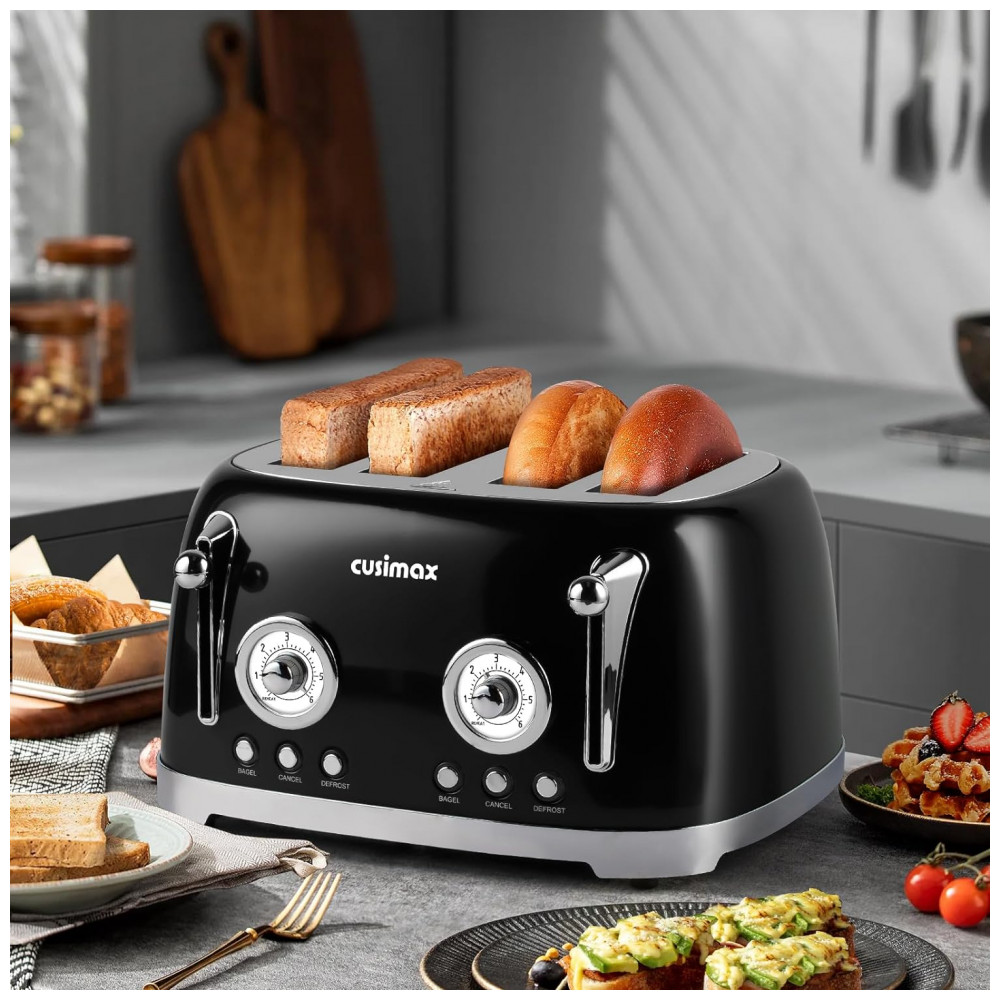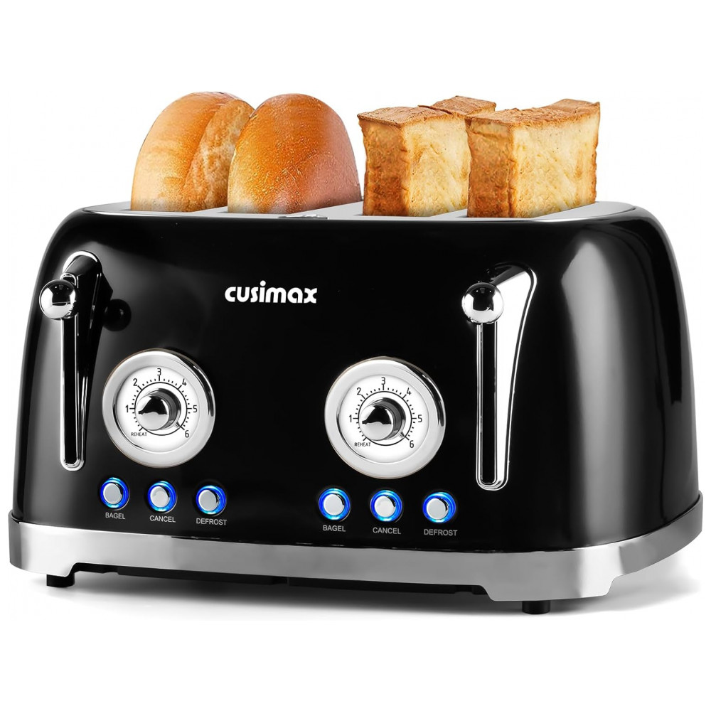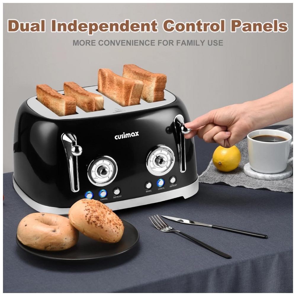 Torradeira Elétrica Retrô 4 Fatias em Aço Inoxidável com 6 Níveis de Tostagem e Painel de Controle Duplo Independentes 110V 1650W CUSIMAX Preto