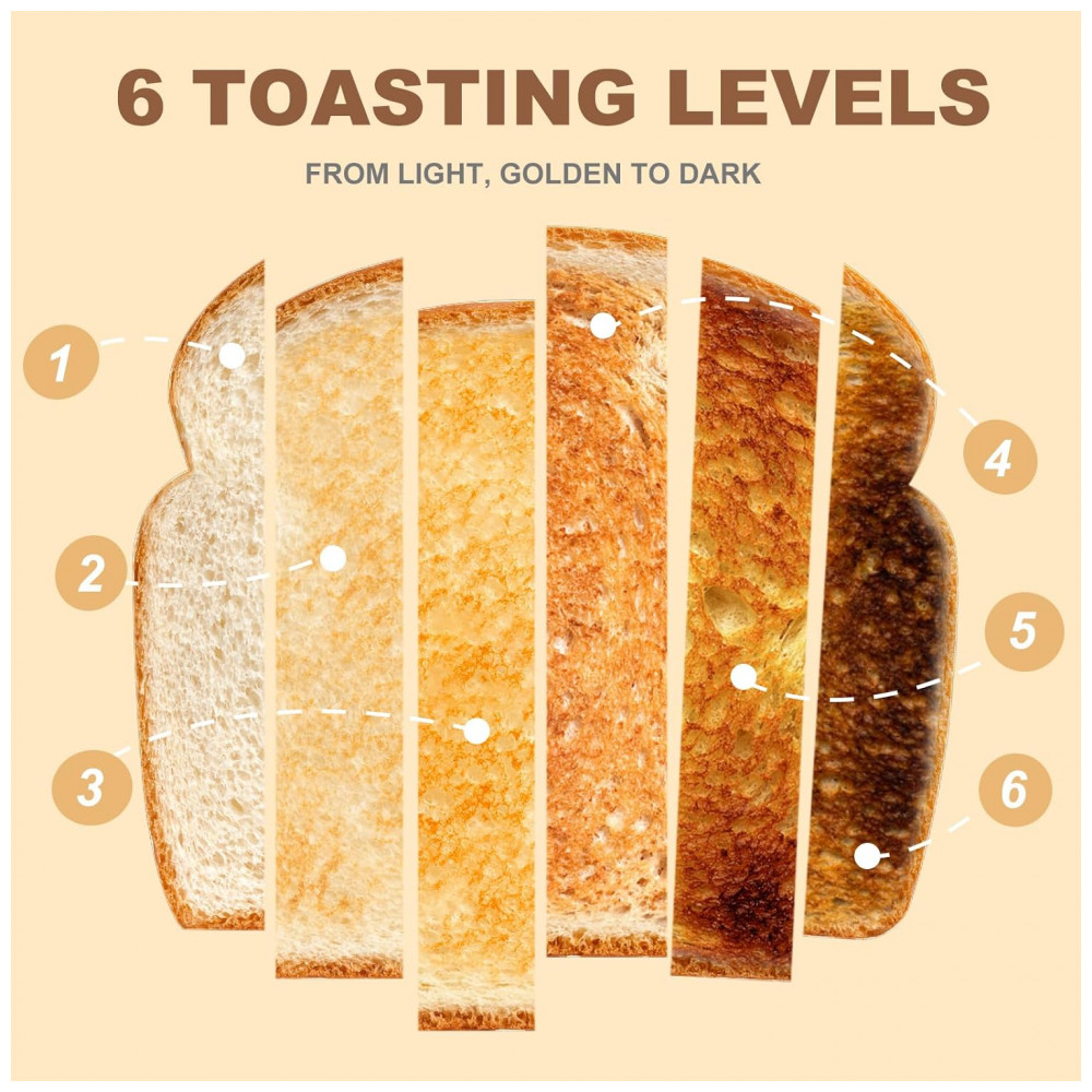 6 Opções de Tostagem: As 6 configurações de tostagem permitem escolher o tom perfeito para o pão, desfrutando de diferentes texturas, de ligeiramente quente a escuro e crocante. Tornando o café da manhã descomplicado e delicioso.