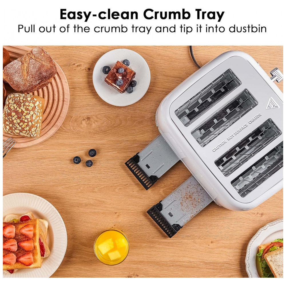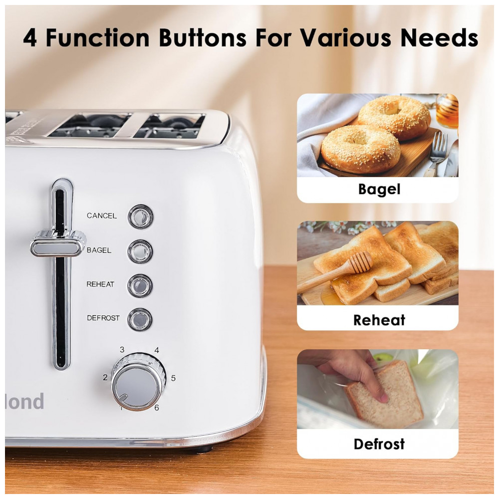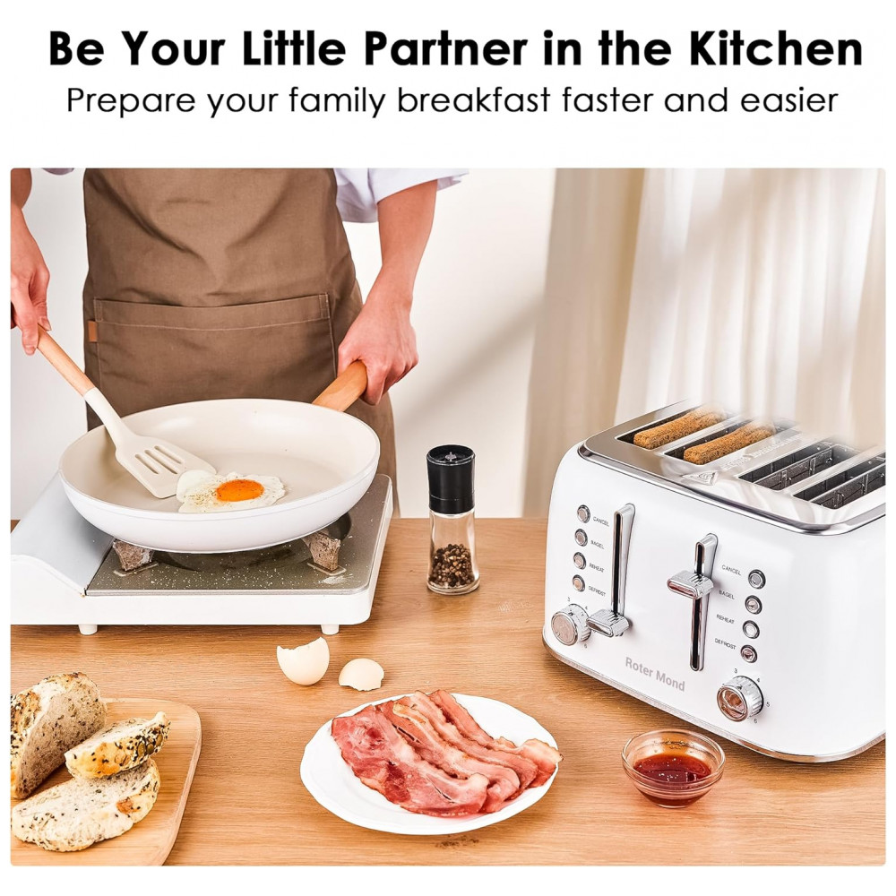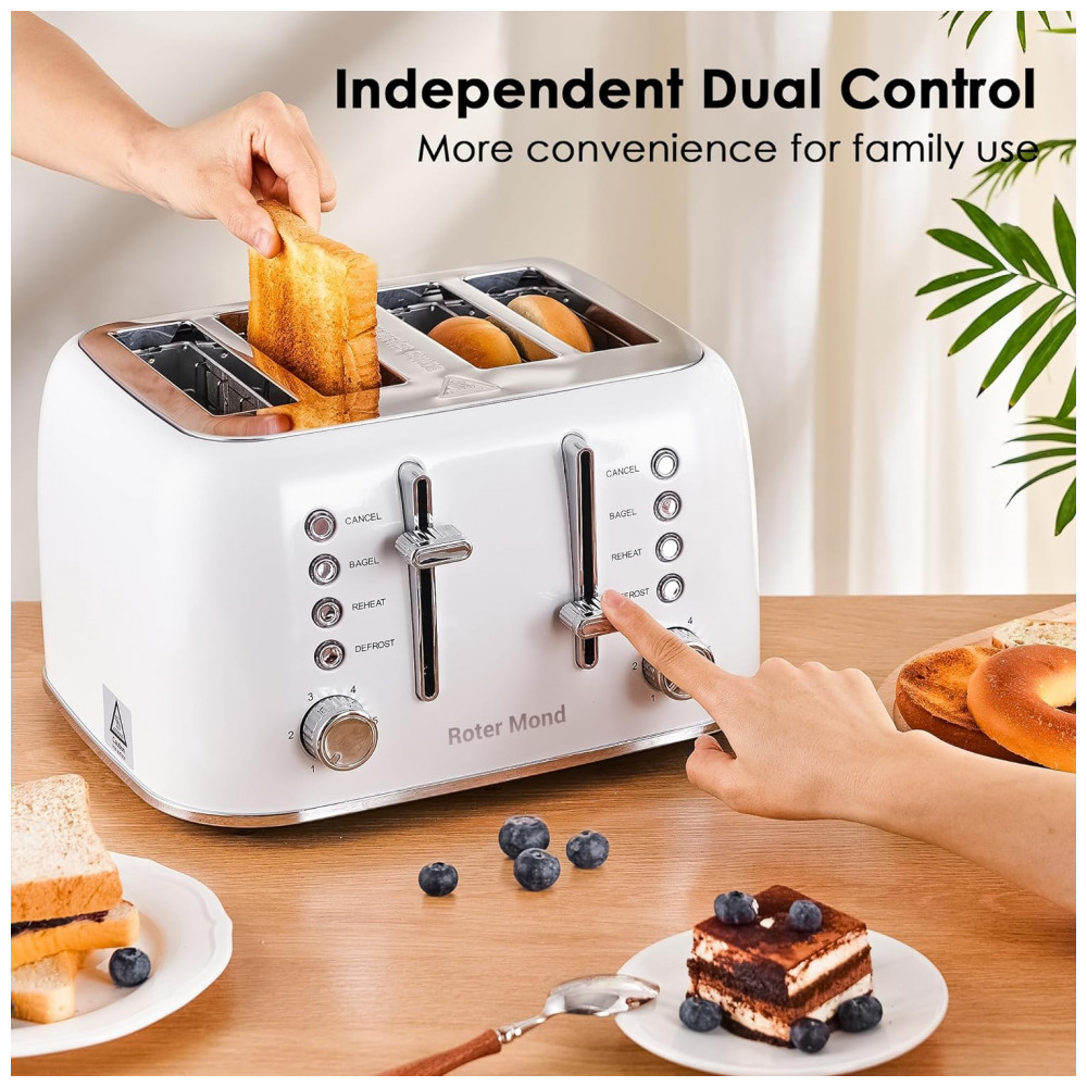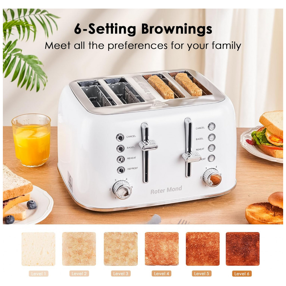 Torradeira Elétrica Retrô 4 Fatias em Aço Inoxidável com Painel de Controle Duplo Independente Bandeja de Migalhas Removível e 6 Níveis de Tostagem 1550W Roter Mond Branca