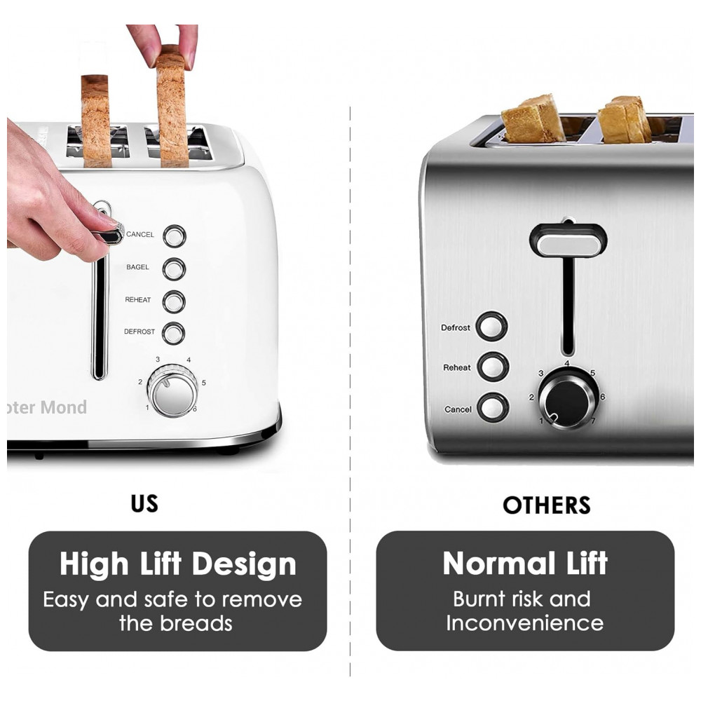 Slots Extra Largos de 3,8 centímetros: Com slots de tamanho generoso de 13 x 3,8 centímetros, a torradeira retrô Roter Mond de 4 fatias pode acomodar facilmente bagels, muffins ingleses e outros pães mais espessos ou menores, como massa fermentada, tortilhas e torradas Texas. Seu design em aço inoxidável ajuda a evitar ferrugem, e qualquer mancha pode ser facilmente limpa com um pano. Materiais de qualidade alimentar e sem BPA proporcionam maior segurança para os membros da família enquanto desfrutam de um delicioso café da manhã.