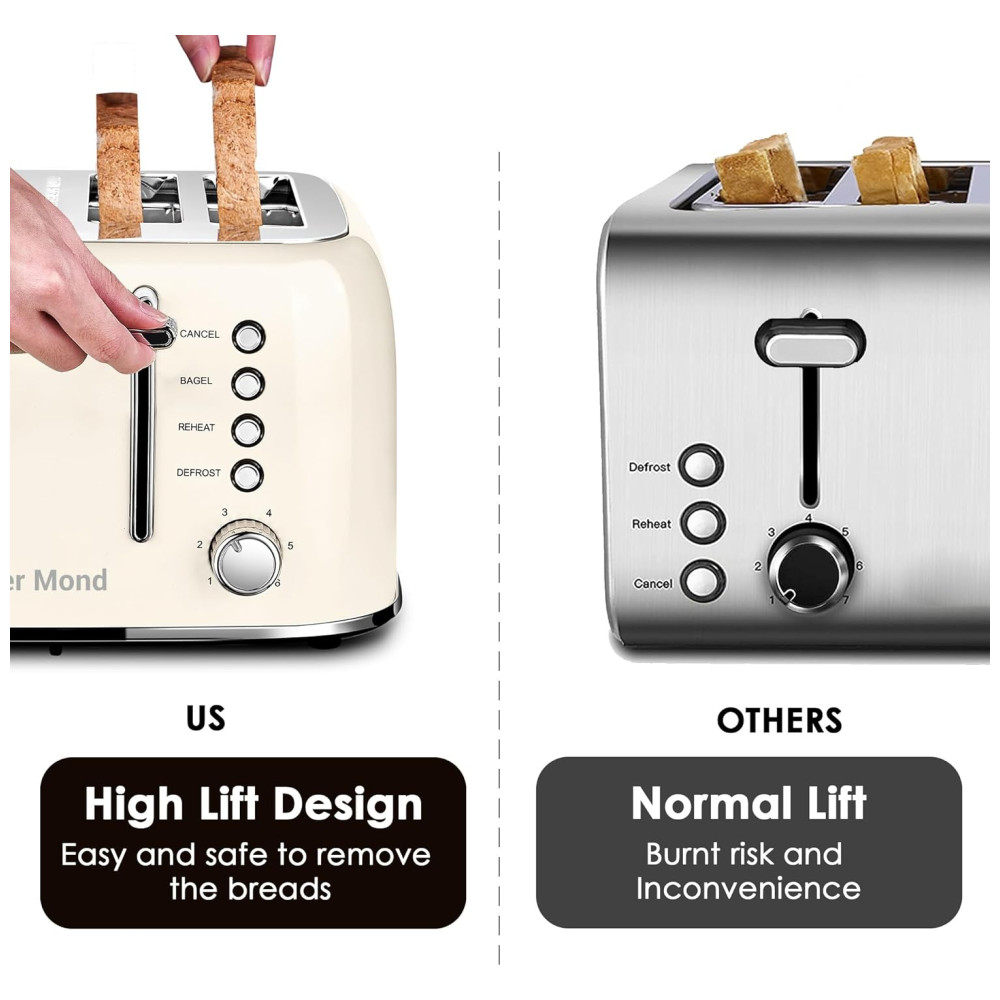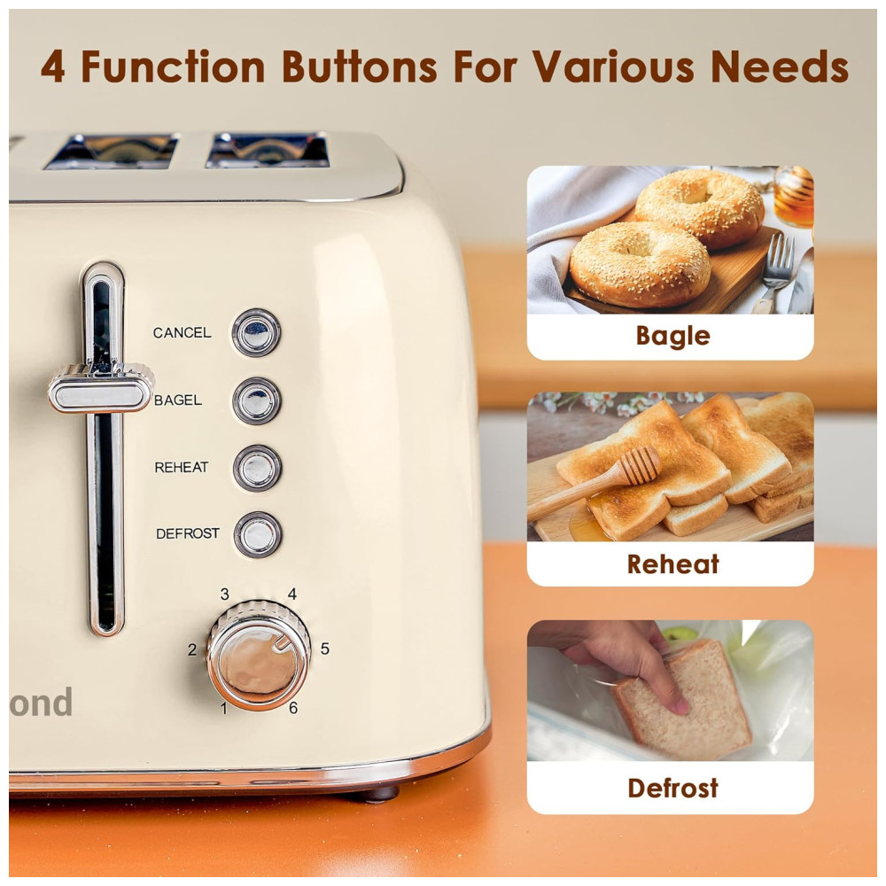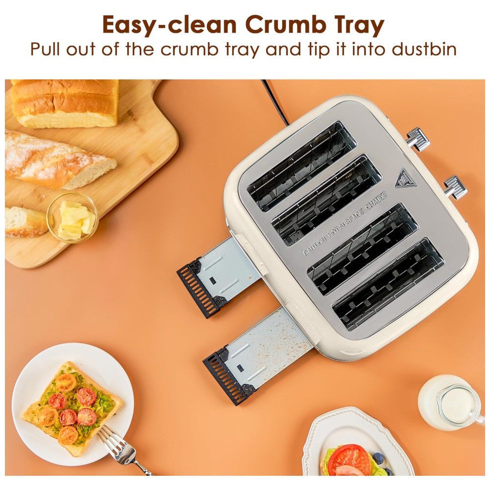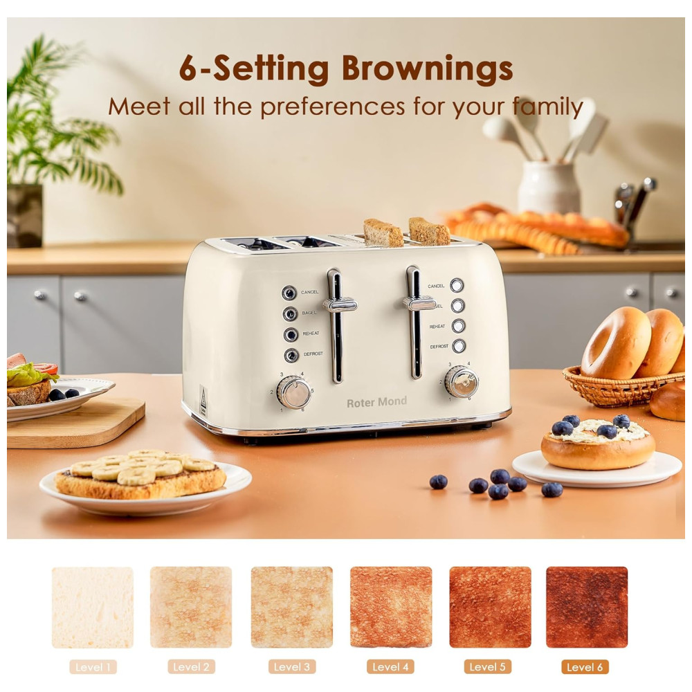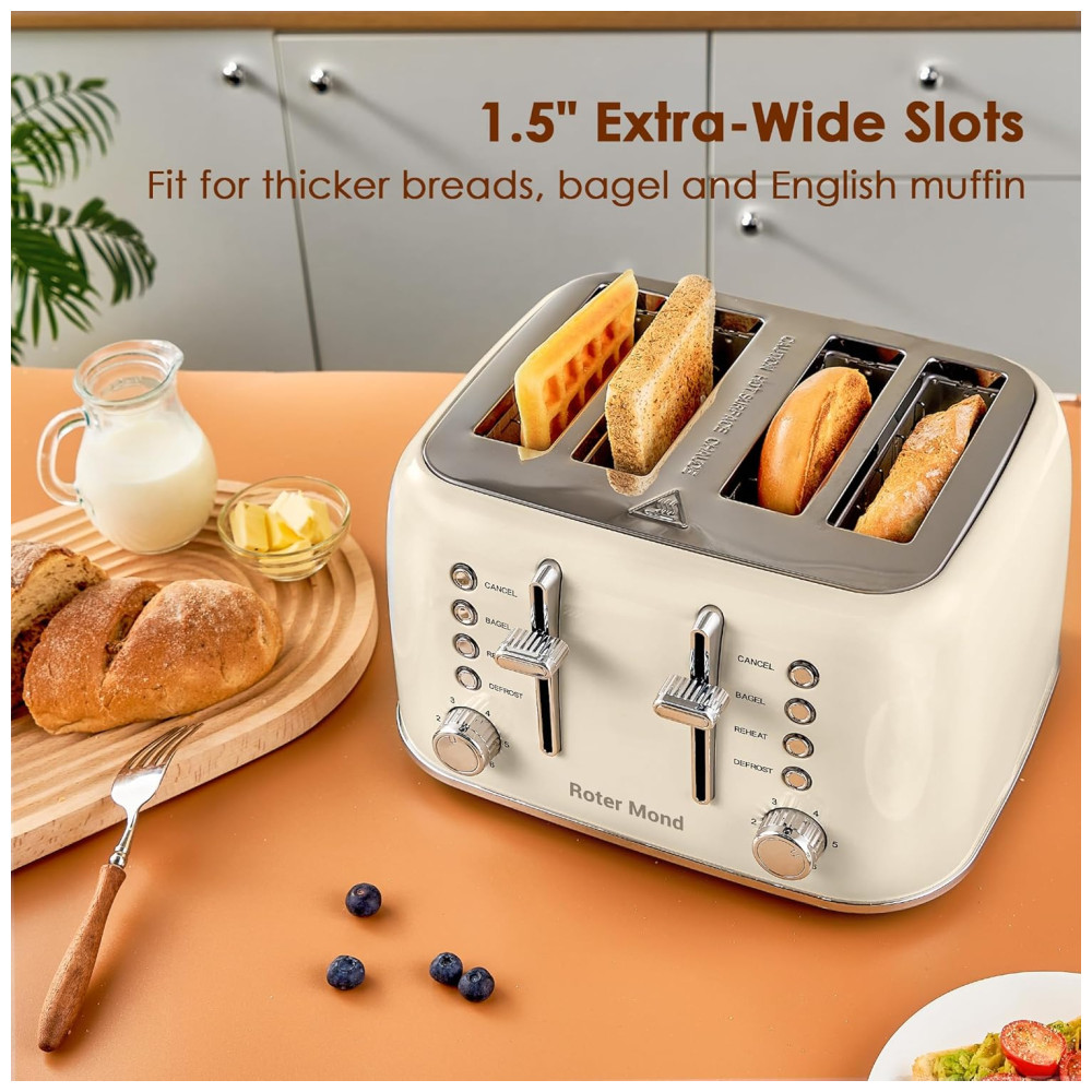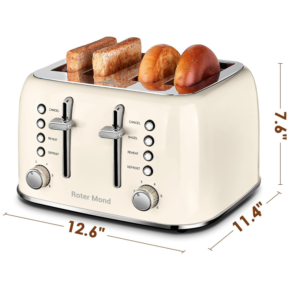 Torradeira Elétrica Retrô 4 Fatias em Aço Inoxidável com Painel de Controle Duplo Independente Bandeja de Migalhas Removível e 6 Níveis de Tostagem 1550W Roter Mond Creme