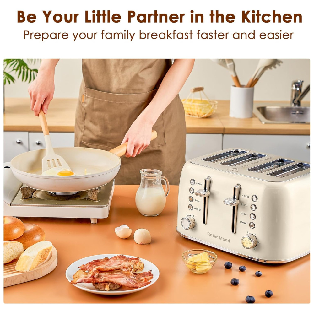 Slots Extra Largos de 3,8 centímetros: Com slots de tamanho generoso de 13 x 3,8 centímetros, a torradeira retrô Roter Mond de 4 fatias pode acomodar facilmente bagels, muffins ingleses e outros pães mais espessos ou menores, como massa fermentada, tortilhas e torradas Texas. Seu design em aço inoxidável ajuda a evitar ferrugem, e qualquer mancha pode ser facilmente limpa com um pano. Materiais de qualidade alimentar e sem BPA proporcionam maior segurança para os membros da família enquanto desfrutam de um delicioso café da manhã.