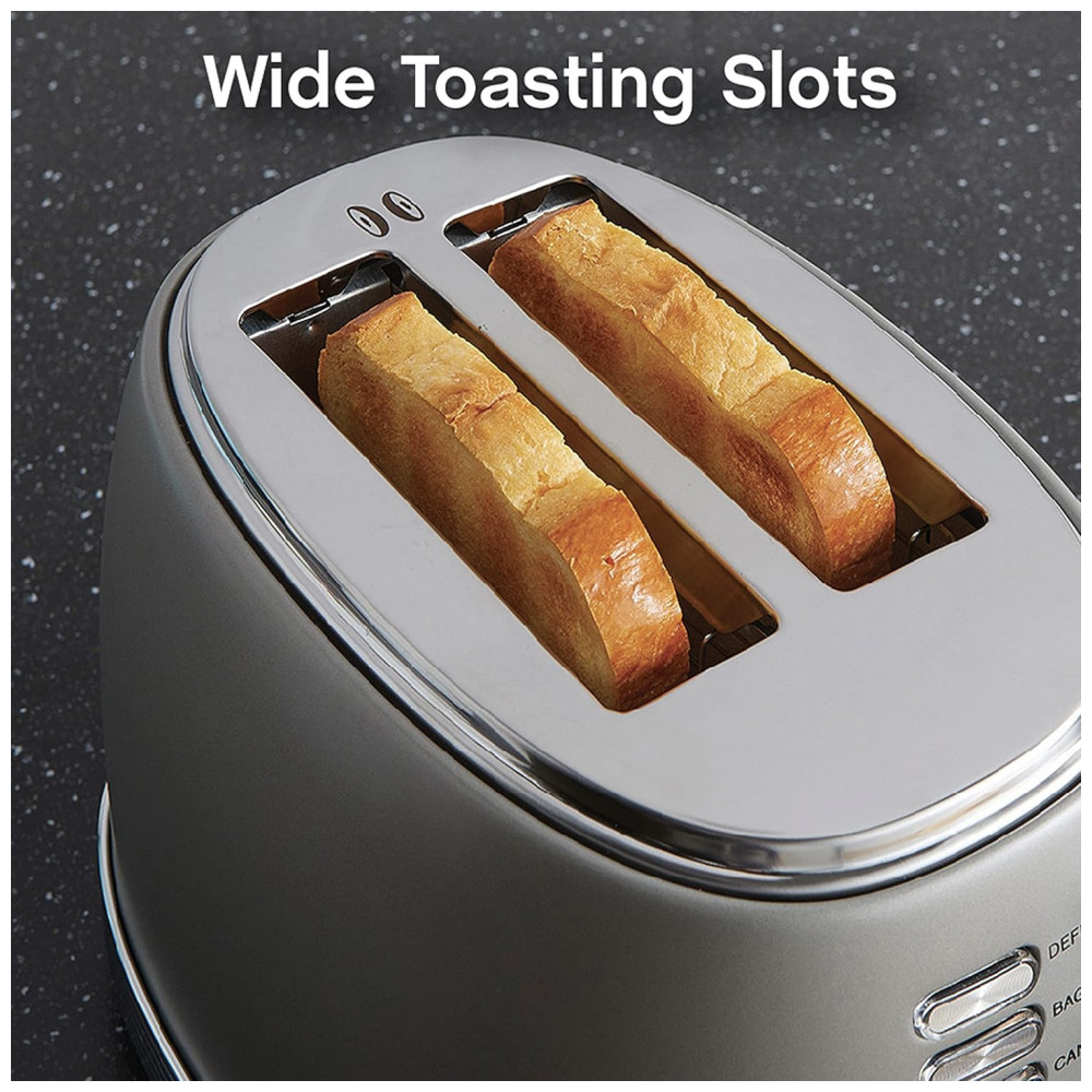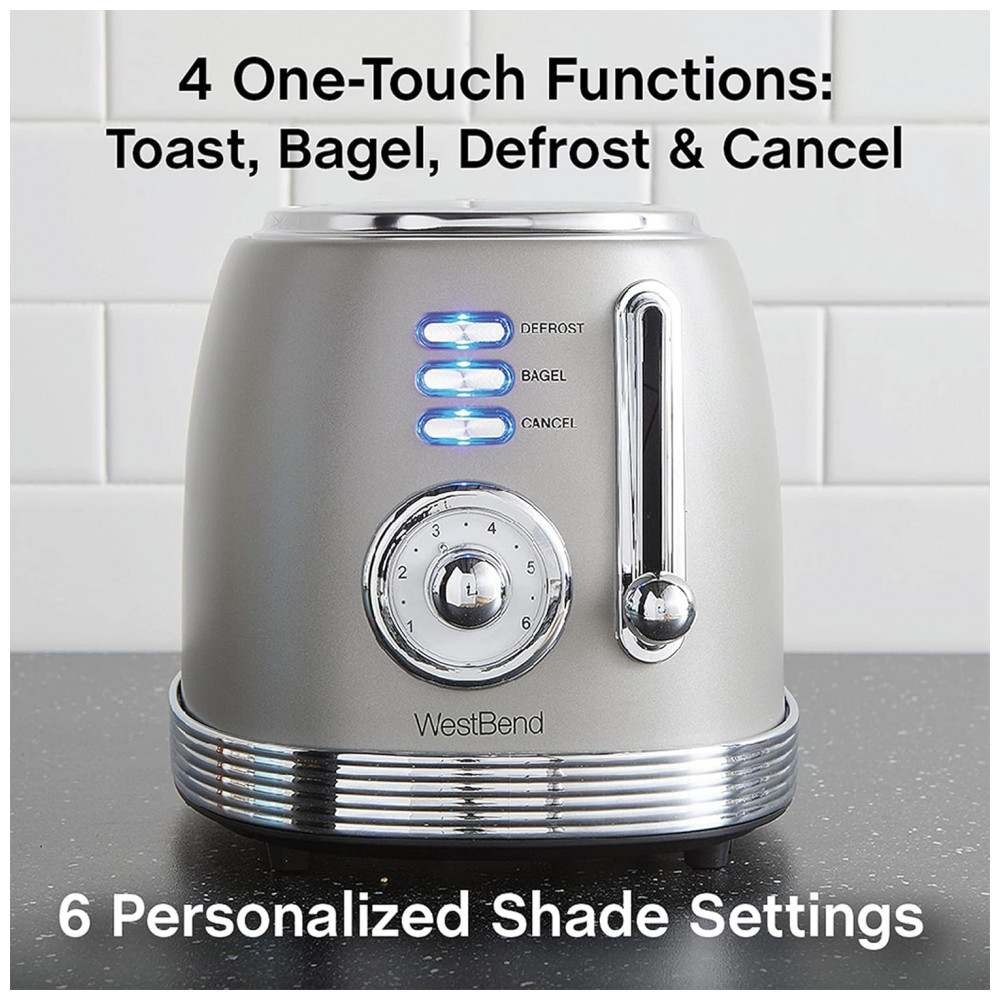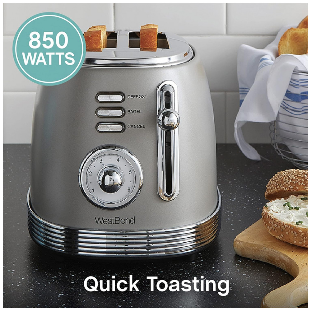 A torradeira elétrica West Bend 2 fatias com design retrô em aço inoxidável na cor cinza foi desenvolvida para uso doméstico no preparo de pães e bagels, reunindo corpo metálico compacto e comandos frontais simples. A potência de 850W atua nas resistências internas para aquecer uniformemente as fendas largas, permitindo torrar diferentes tipos de pães, waffles e bagels em ciclos ajustáveis de tostagem.