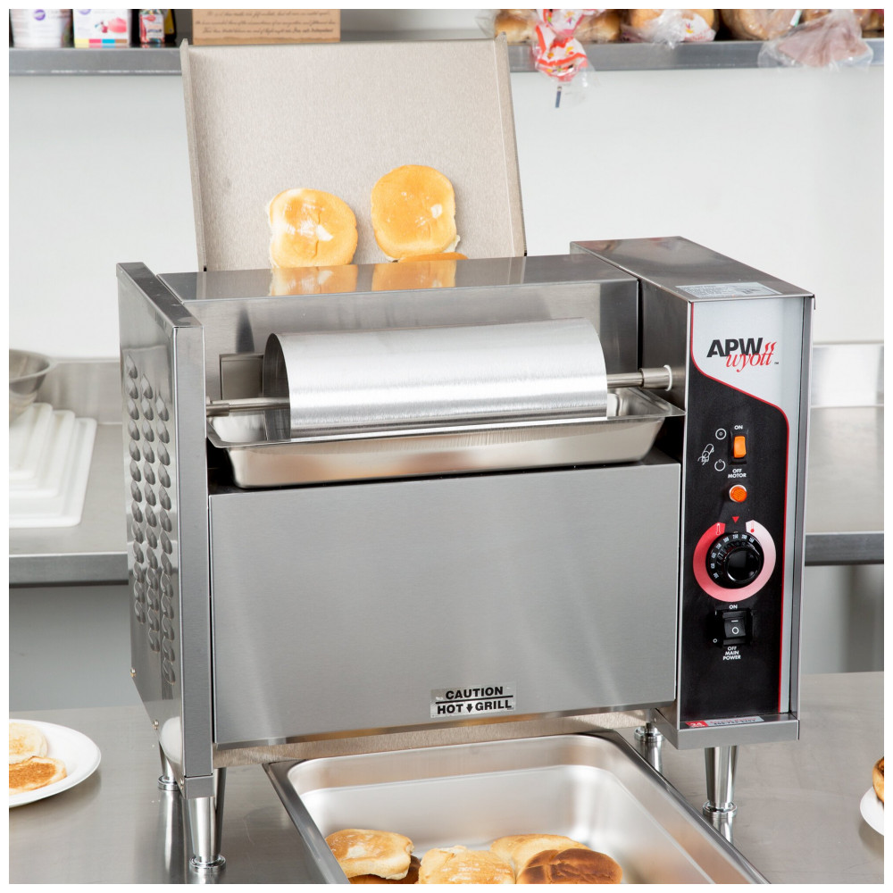 A Torradeira Grill de Esteira Vertical APW Wyott M952 208V é perfeita para preparar até 865 metades de pães por hora. Com potência de 2780W, inclui 2 folhas de Teflon e uma esteira para pães. Sua resistente chapa de aço pode ser controlada termostaticamente, permitindo um tostado perfeito e uniforme em cada pedaço.
