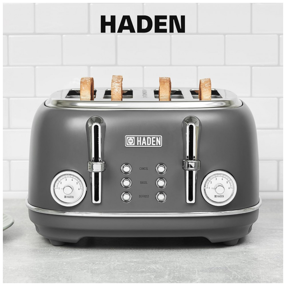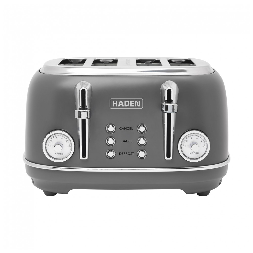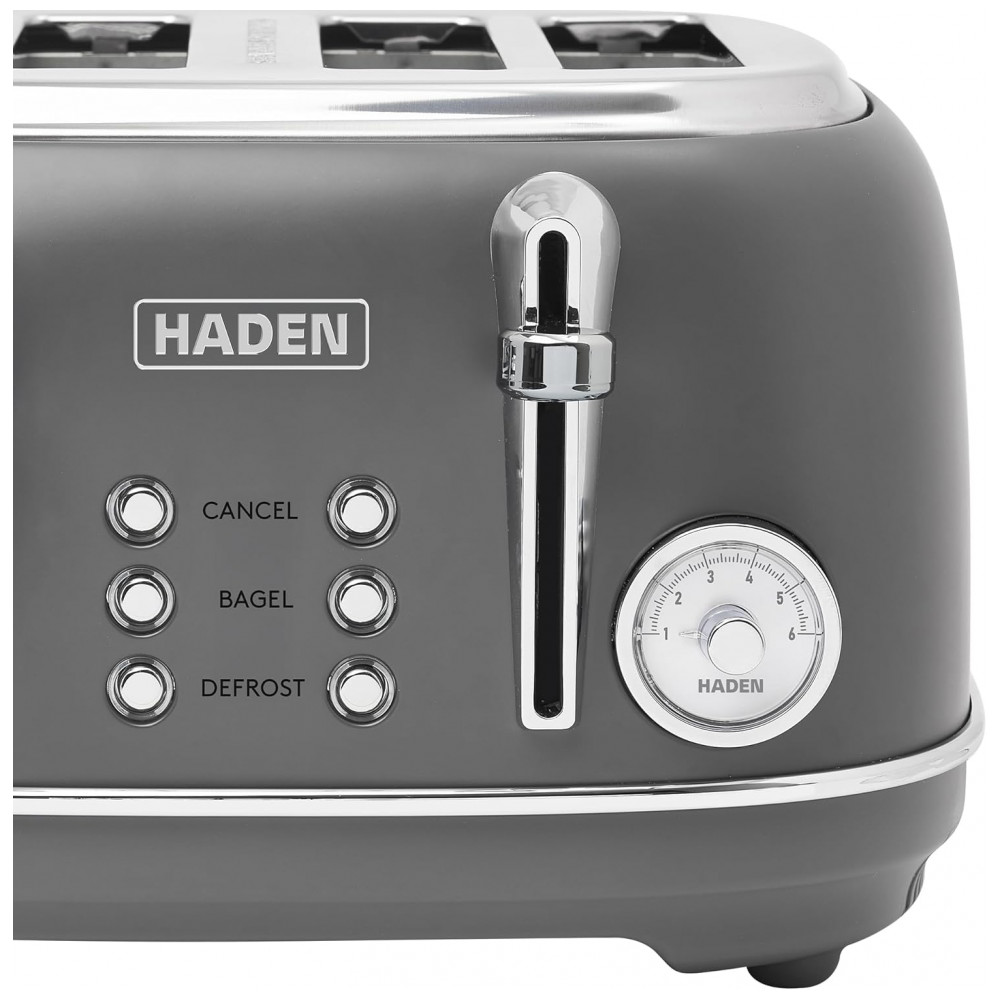 A torradeira HADEN Chelsea 4 fatias é produzida em aço inoxidável com acabamento esmaltado cinza fosco e detalhes cromados, indicada para cozinhas residenciais que precisam de maior capacidade de preparo simultâneo de torradas. As quatro fendas largas com centragem automática permitem torrar pães, bagels, waffles e fatias mais espessas de forma uniforme.